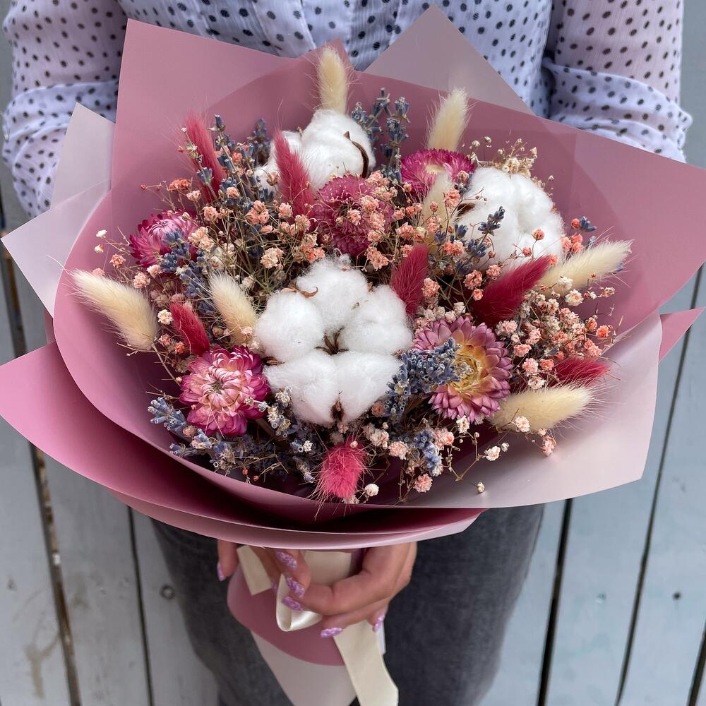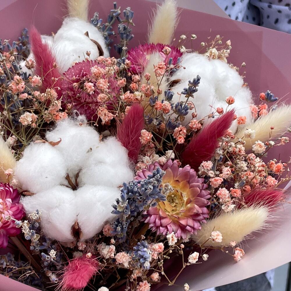 Гипсофила - 2 шт. Хлопок - 3 шт. Упаковка дизайнерская - 1 шт. Лагурус - 14 шт. Гелихризум - 5 шт. лаванда(пучок) - 1 шт.