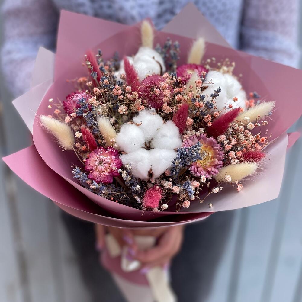 Такой букет будет отличным дополнением к подарку на день рождения, юбилей, свадьбу, рождение ребёнка, годовщину.Им можно порадовать маму, жену, дочь, любимую, подругу, коллегу по работе директора.Ухода не требует, сухоцветы сохраняют свой цвет и свойства продолжительное время.
