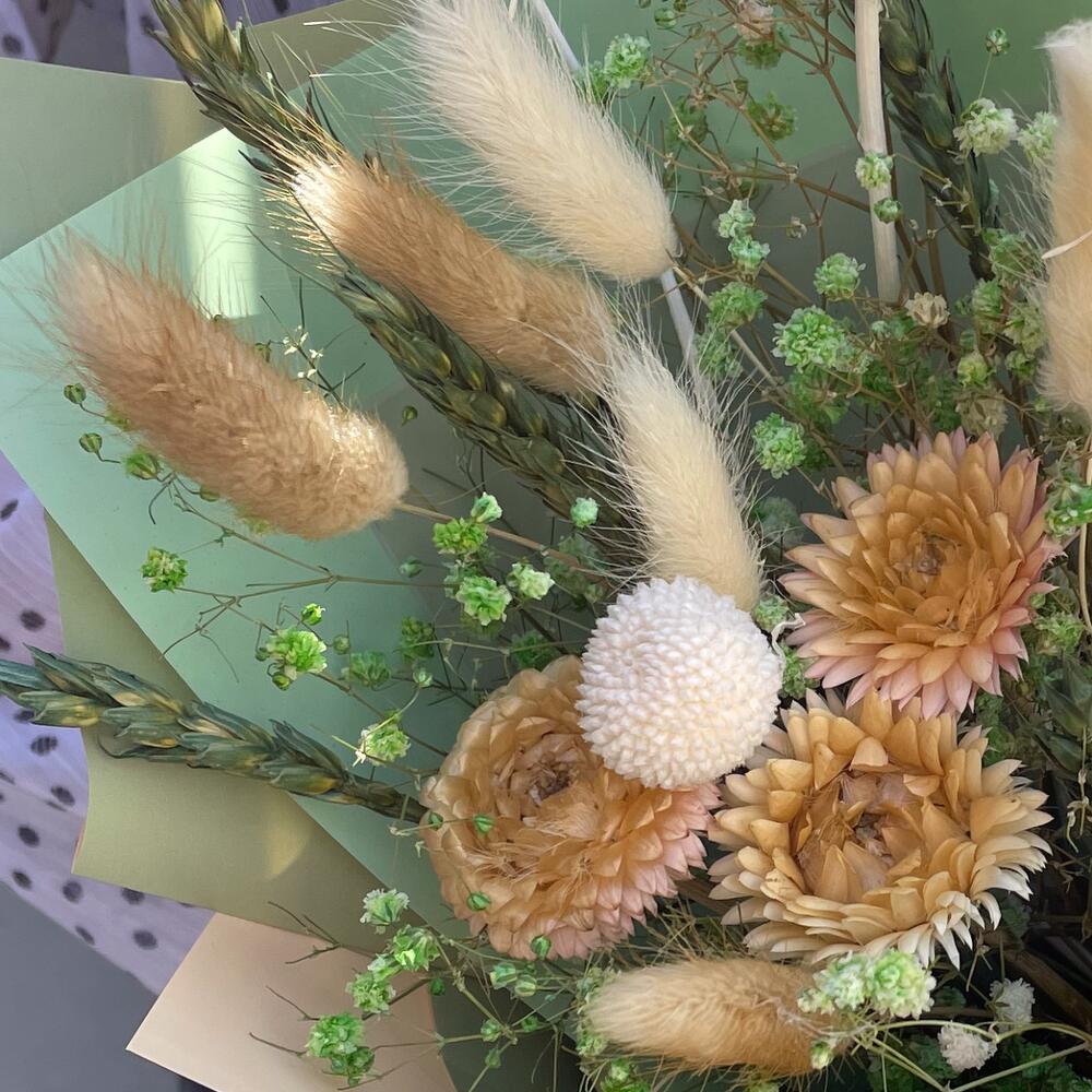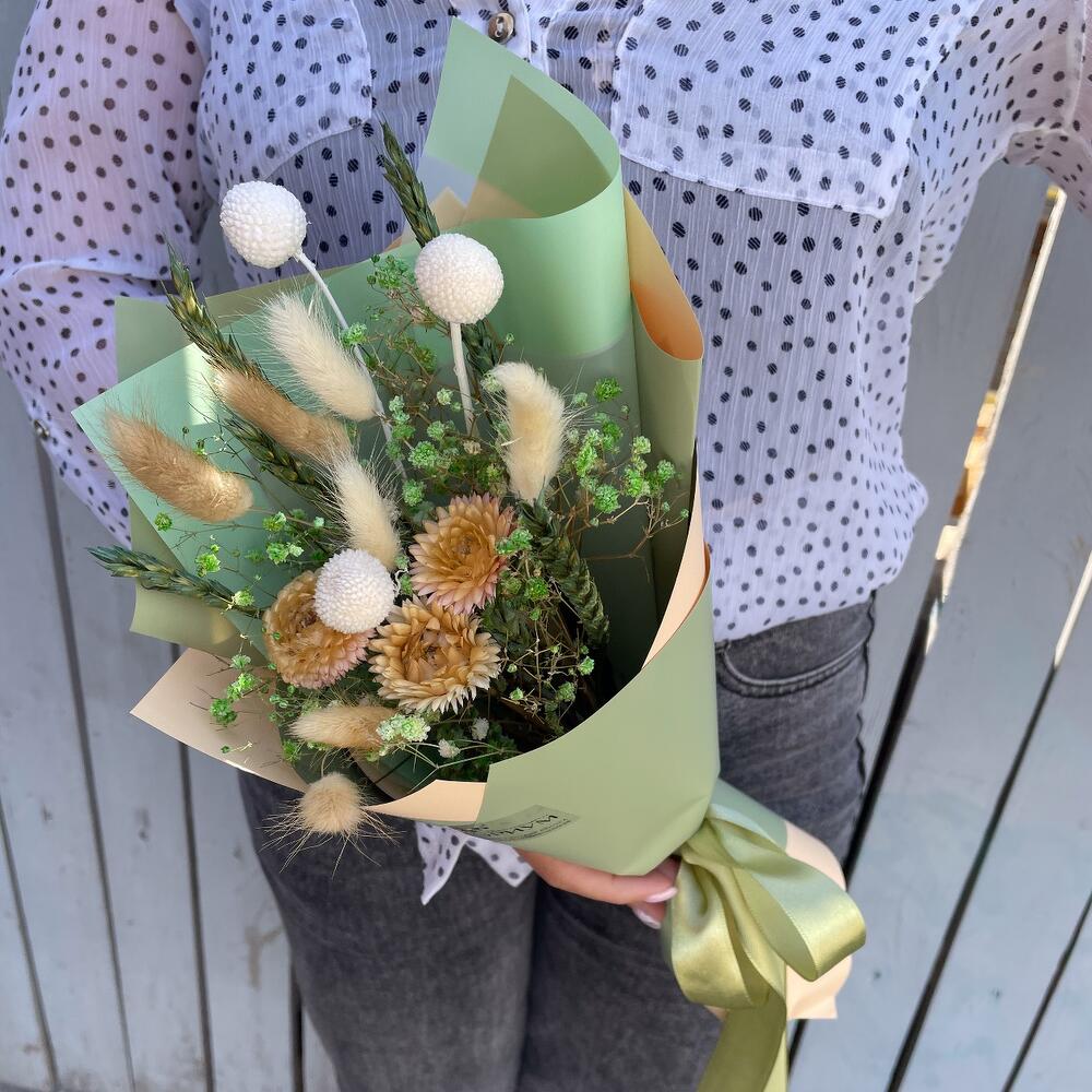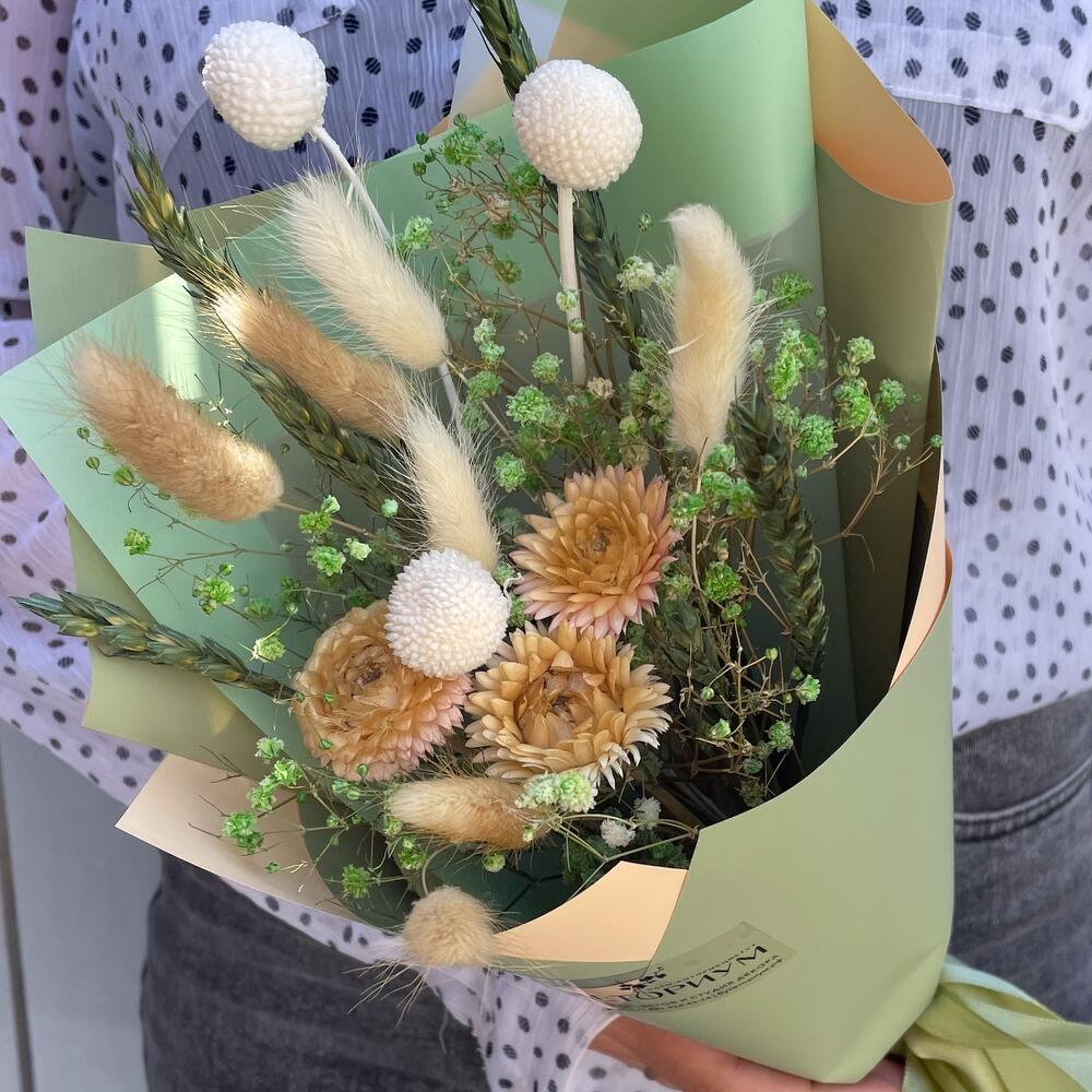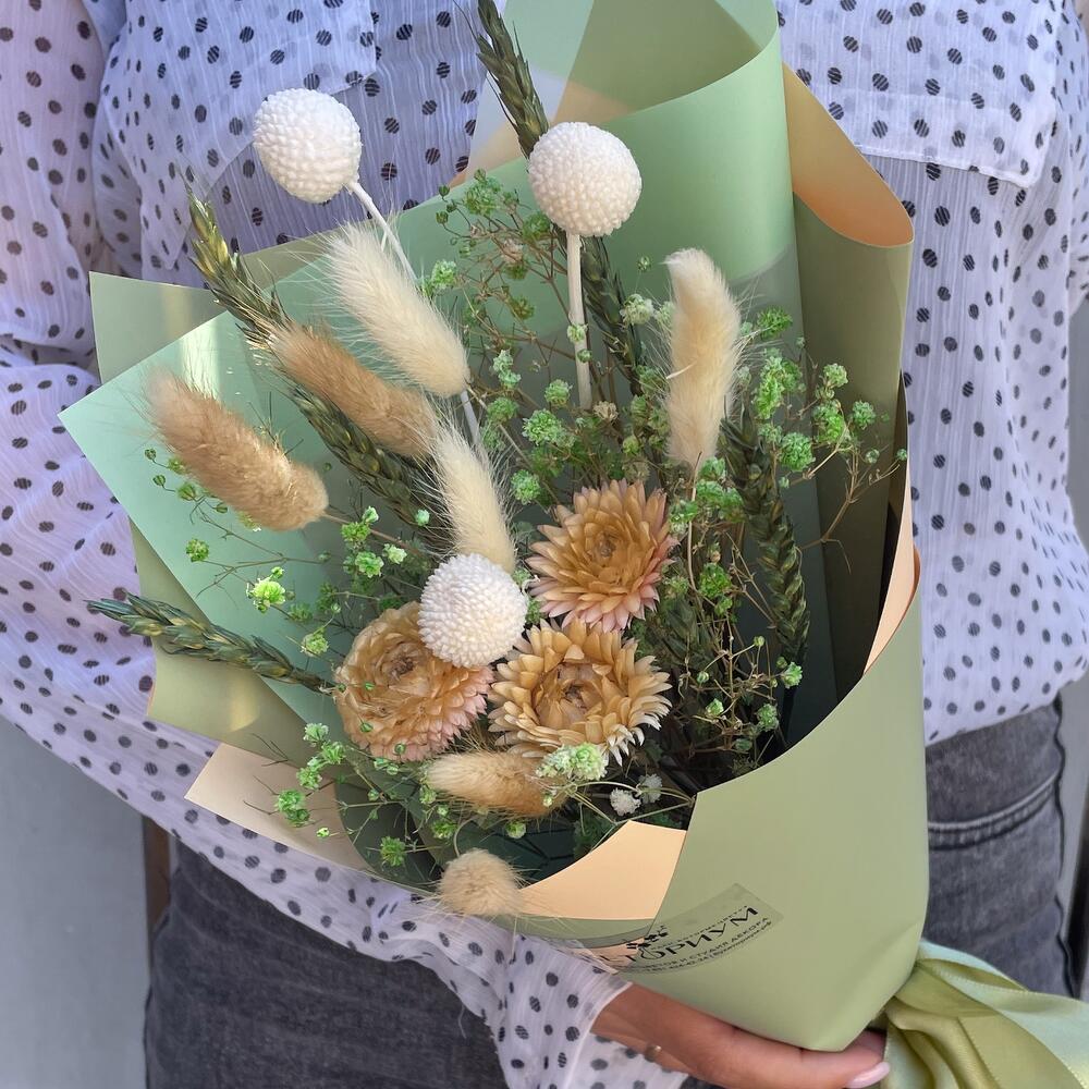Краспедия - 3 шт. Упаковка дизайнерская - 1 шт. Лагурус - 7 шт. Колос - 6 шт. Гипсофила крашеная - 1 шт. Гелихризум - 3 шт.