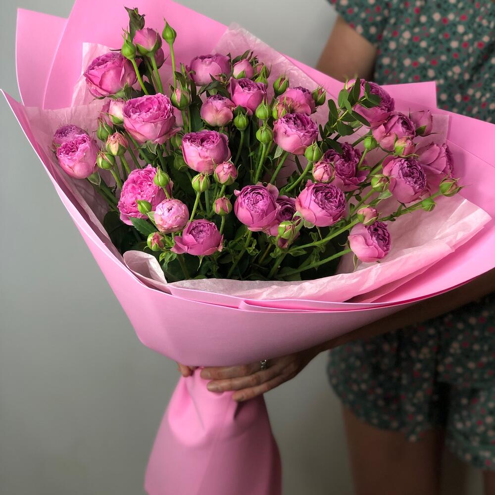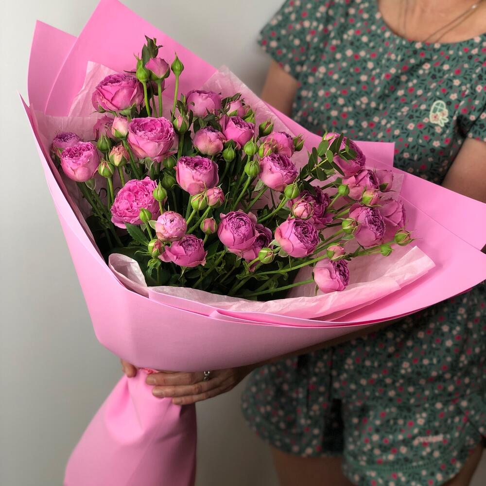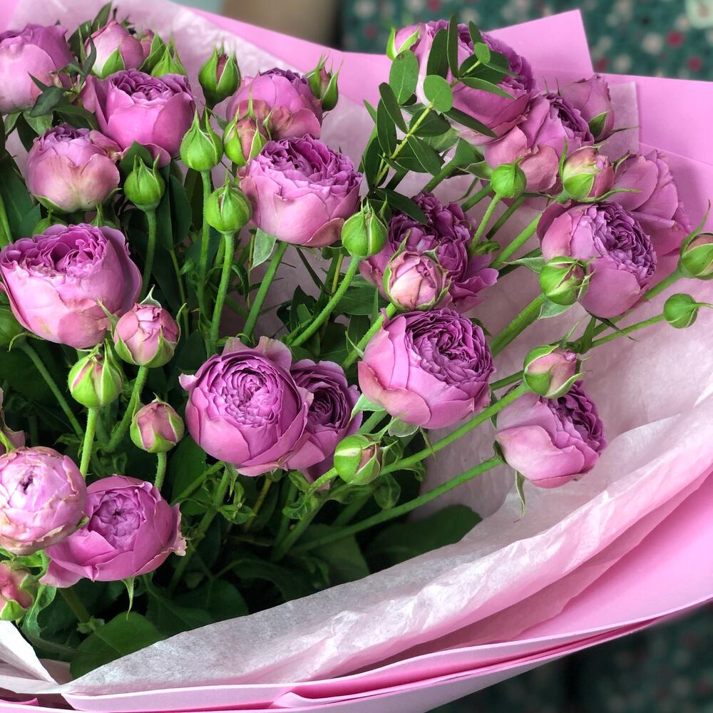 Эвкалипт – 2 шт. Лента атласная – 2 шт. Тишью – 2 шт. Роза кустовая пионовидная – 7 шт. Фоамиран (упаковка) – 2 шт.