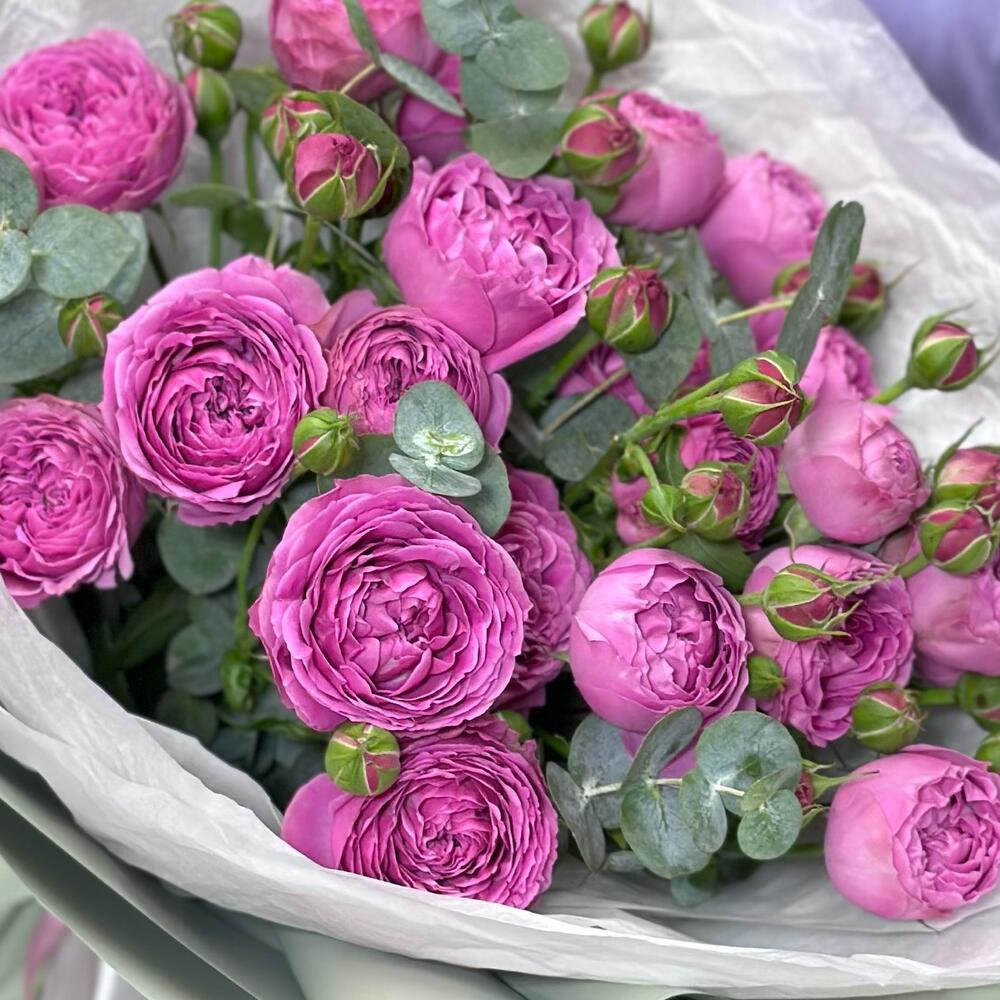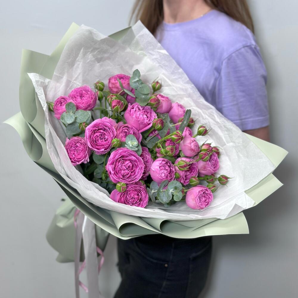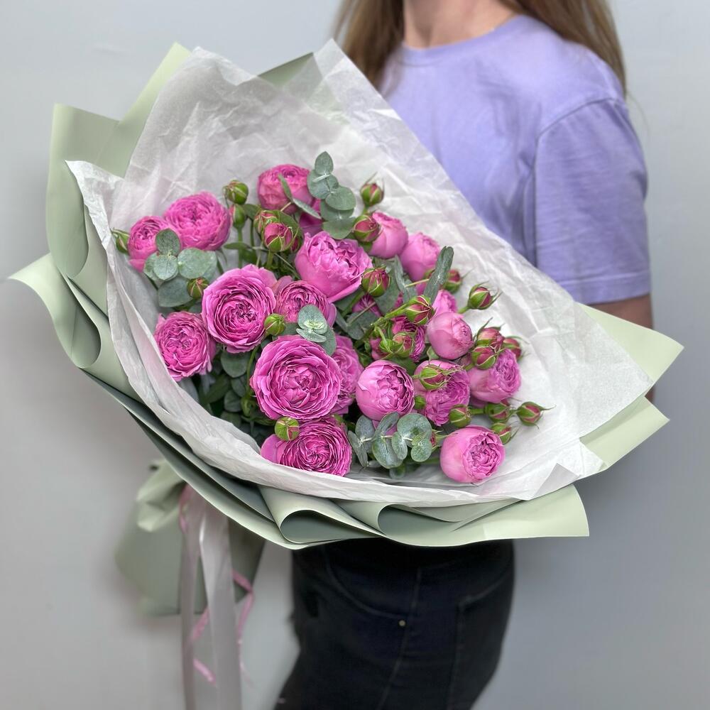 Шикарный букет из кустовых пионовидных розовых роз с ароматной зеленью эвкалипта в фисташковой упаковке Букет из пионовидных роз отлично подойдет, если Вы хотите рассказать о своих чувствах, подарить его на свадьбу, юбилей, день рождения, 14 февраля, 8 марта, коллеге, любимой жене или подруге Фирменная открытка и подкормка для цветов в подарок