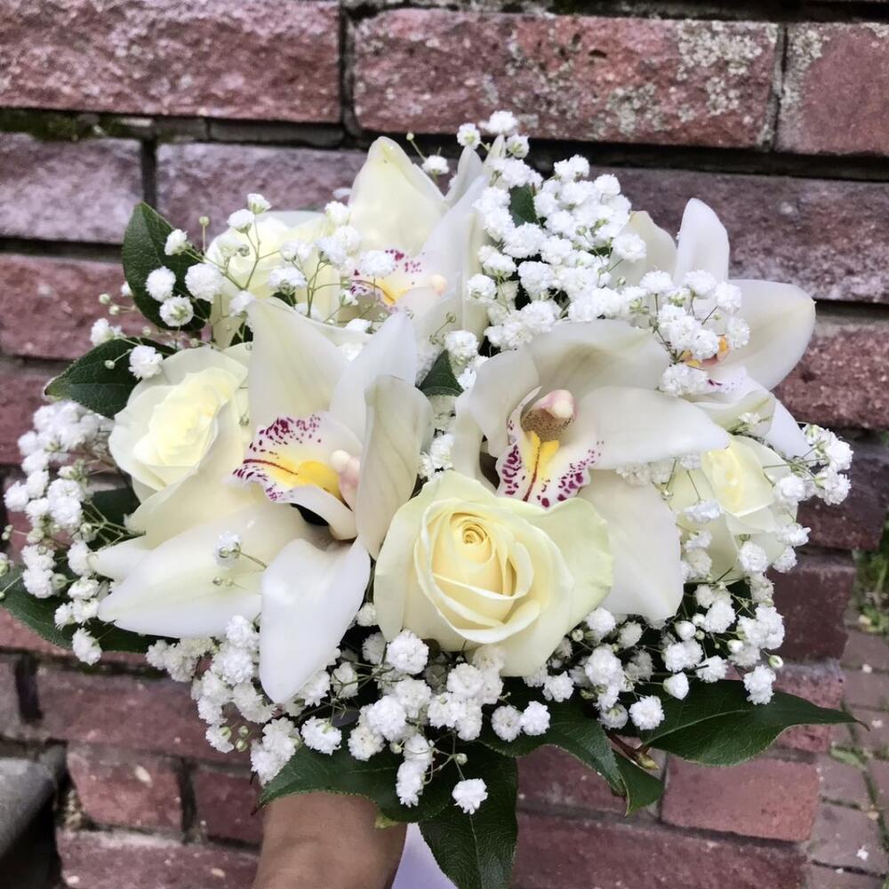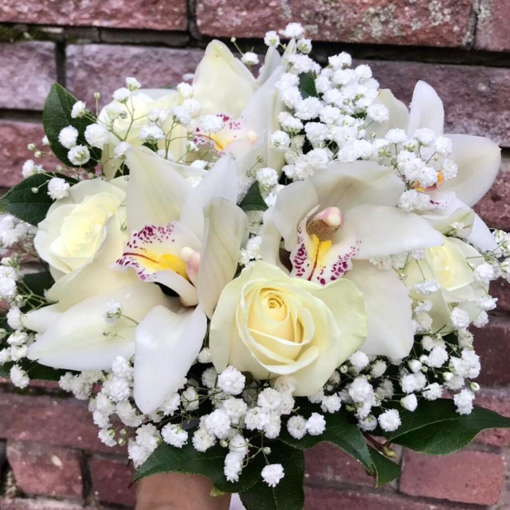 Гипсофила – 2 шт. Рускус – 7 шт. Лента белая – 1 шт. Орхидея Цимбидиум белая – 5 шт. Роза белая 50 см – 5 шт.