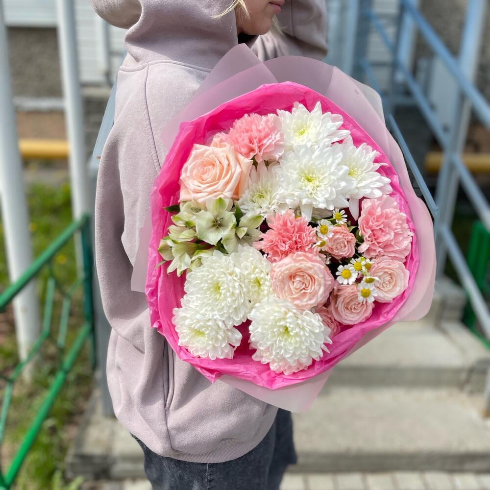 Альстромерия - 1 шт. Роза кустовая - 1 шт. Танацетум - 1 шт. Хризантема кустовая - 2 шт. Роза - 1 шт. Упаковка - 1 шт. Лента атласная - 1 шт. Диантус - 2 шт.