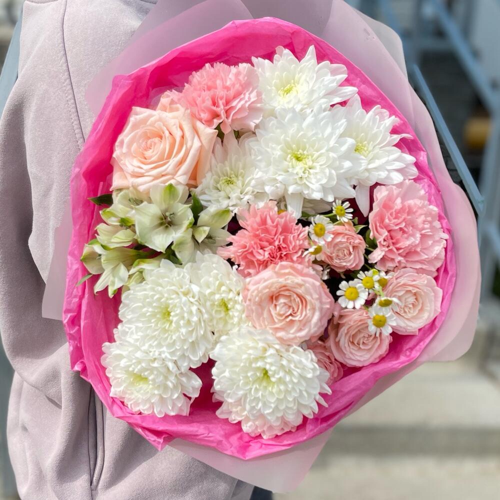 Альстромерия – 1 шт. Роза кустовая – 1 шт. Танацетум – 1 шт. Хризантема кустовая – 2 шт. Роза – 1 шт. Упаковка – 1 шт. Лента атласная – 1 шт. Диантус – 2 шт.