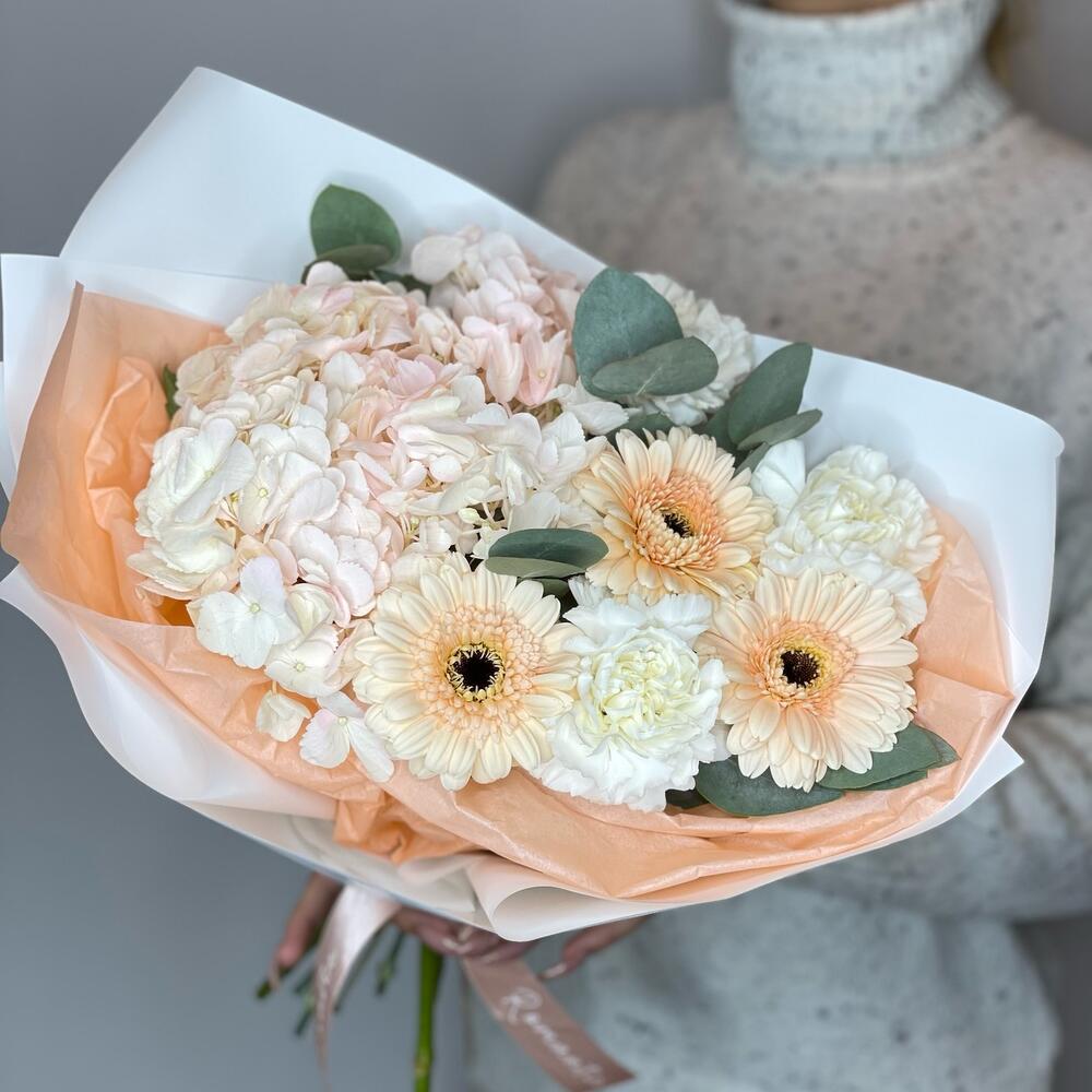 Гортензия - 1 шт. Эвкалипт - 2 шт. Гербера - 3 шт. Гвоздика сортовая - 3 шт. Упаковка дизайнерская - 1 шт. подкормка для срезанных цветов - 1 шт.