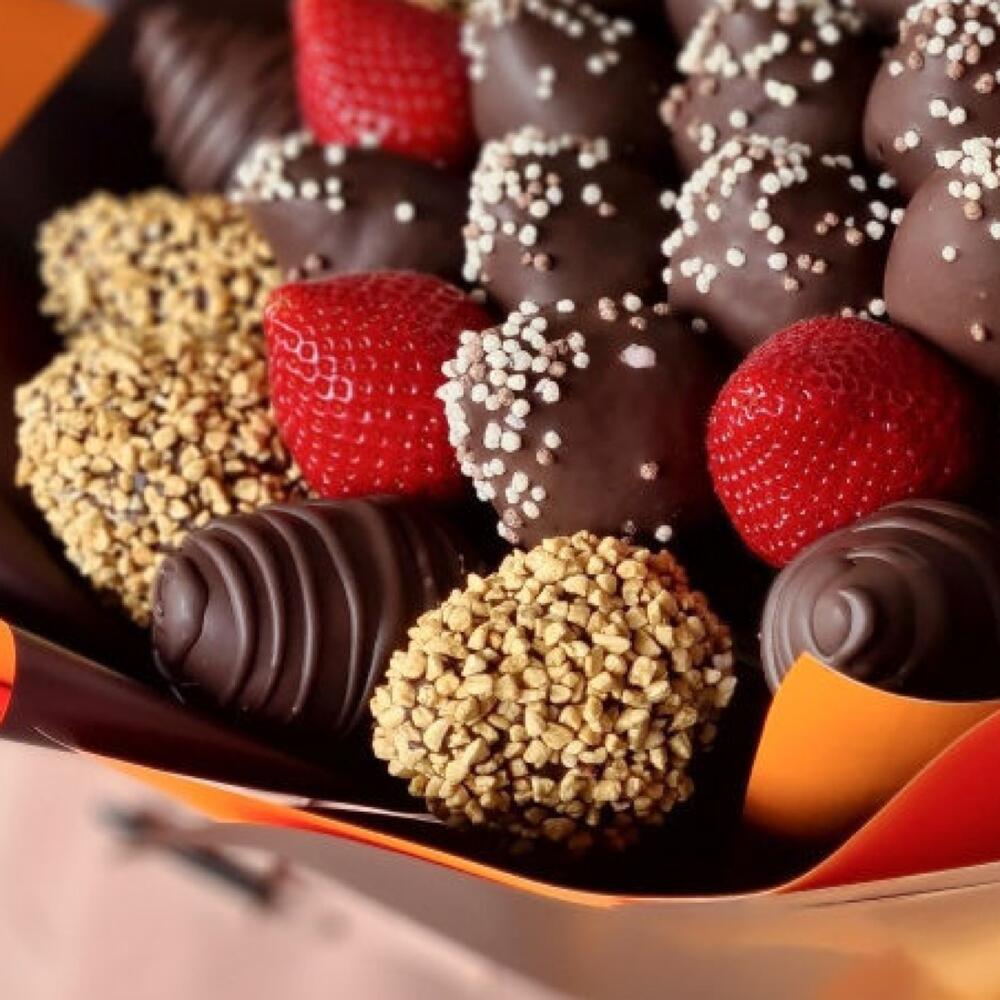Изумительный букет клубники в темном бельгийском шоколаде ,в сочетании с орехами и рисовыми шариками.Подарит море блаженства.
