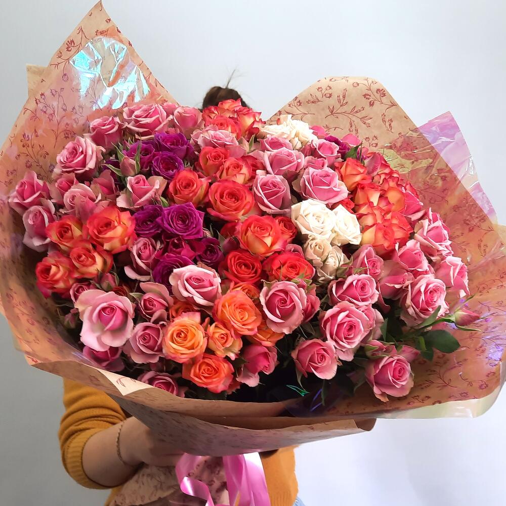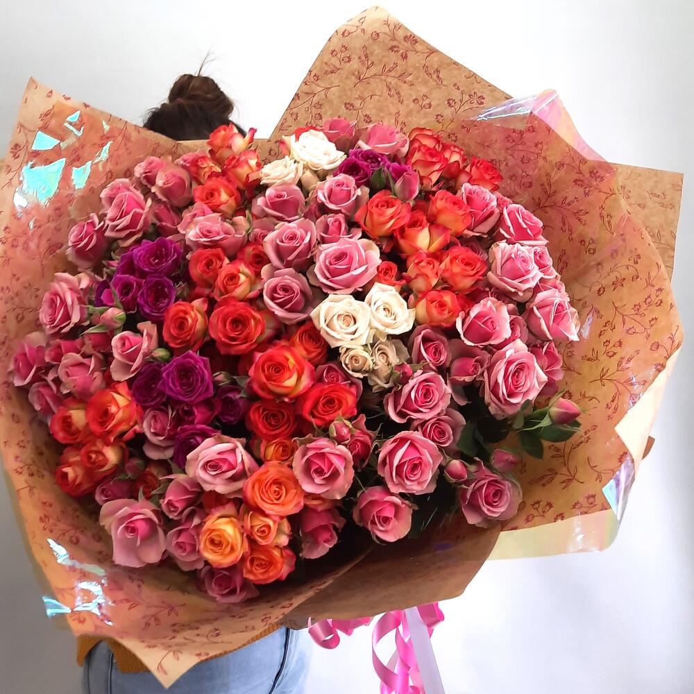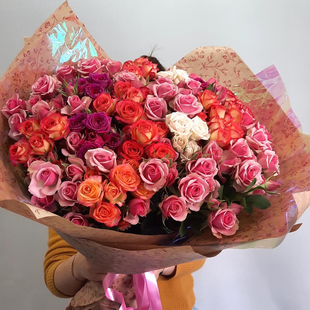Пышный букет из Кустовой розы способный удивить и порадовать получателя с оформлением.Оформление по согласованию может быть любым.Цветовую гамму букета можно обговорить с менеджером по телефону.На фото пример оформления. Мы гарантируем сделать букет из всех наименований, но может быть иногда изменена цветовая гамма, в силу того, что цветы в разных поставках могут быть немного другого оттенка, спасибо за понимание.