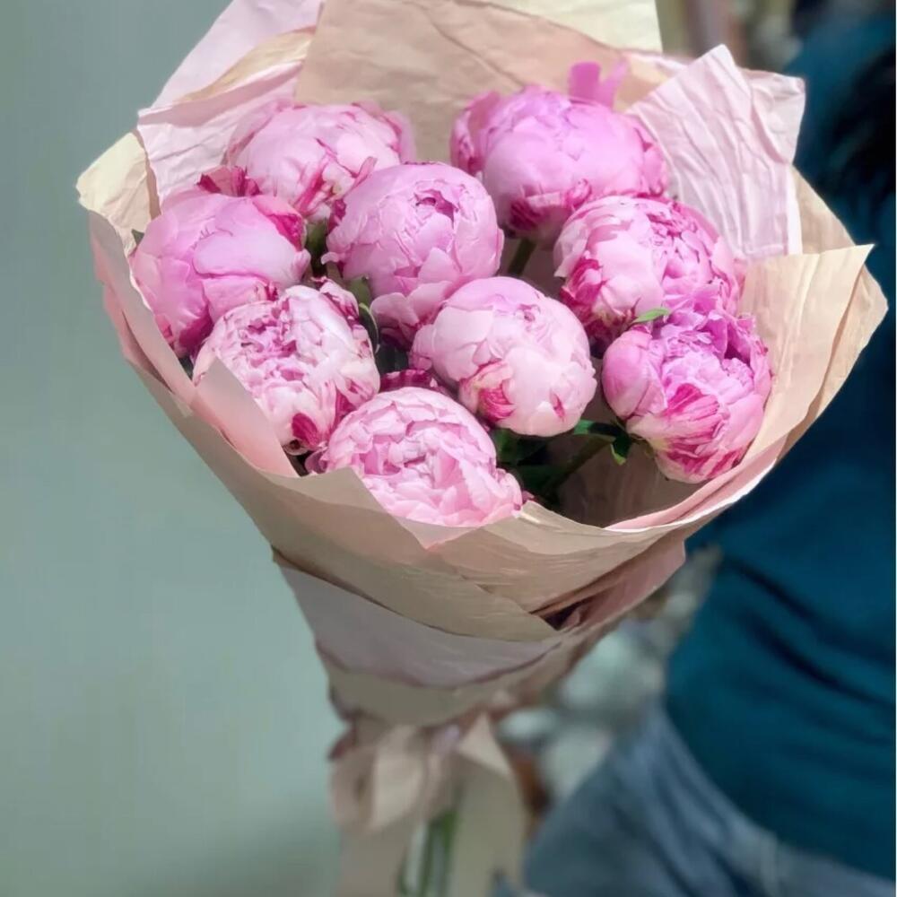 Лента атласная – 1 шт. Пион Сара Бернар – 9 шт. Упаковка дизайнерская – 3 шт.