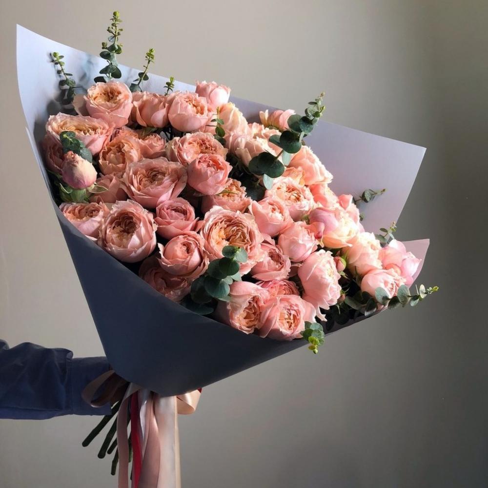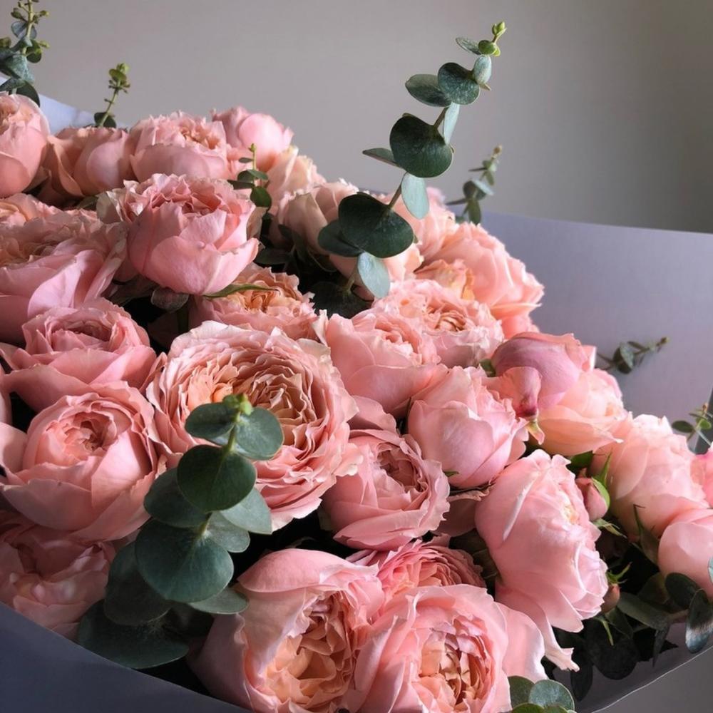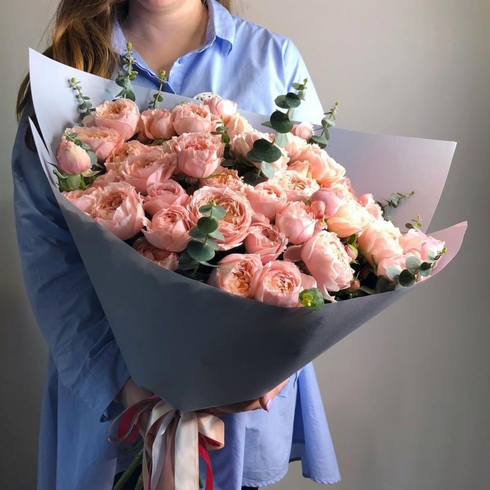 Эвкалипт Baby Blue – 5 шт. Оформление матовая пленка – 2 шт. роза пионовидная джульетта кустовая – 11 шт.