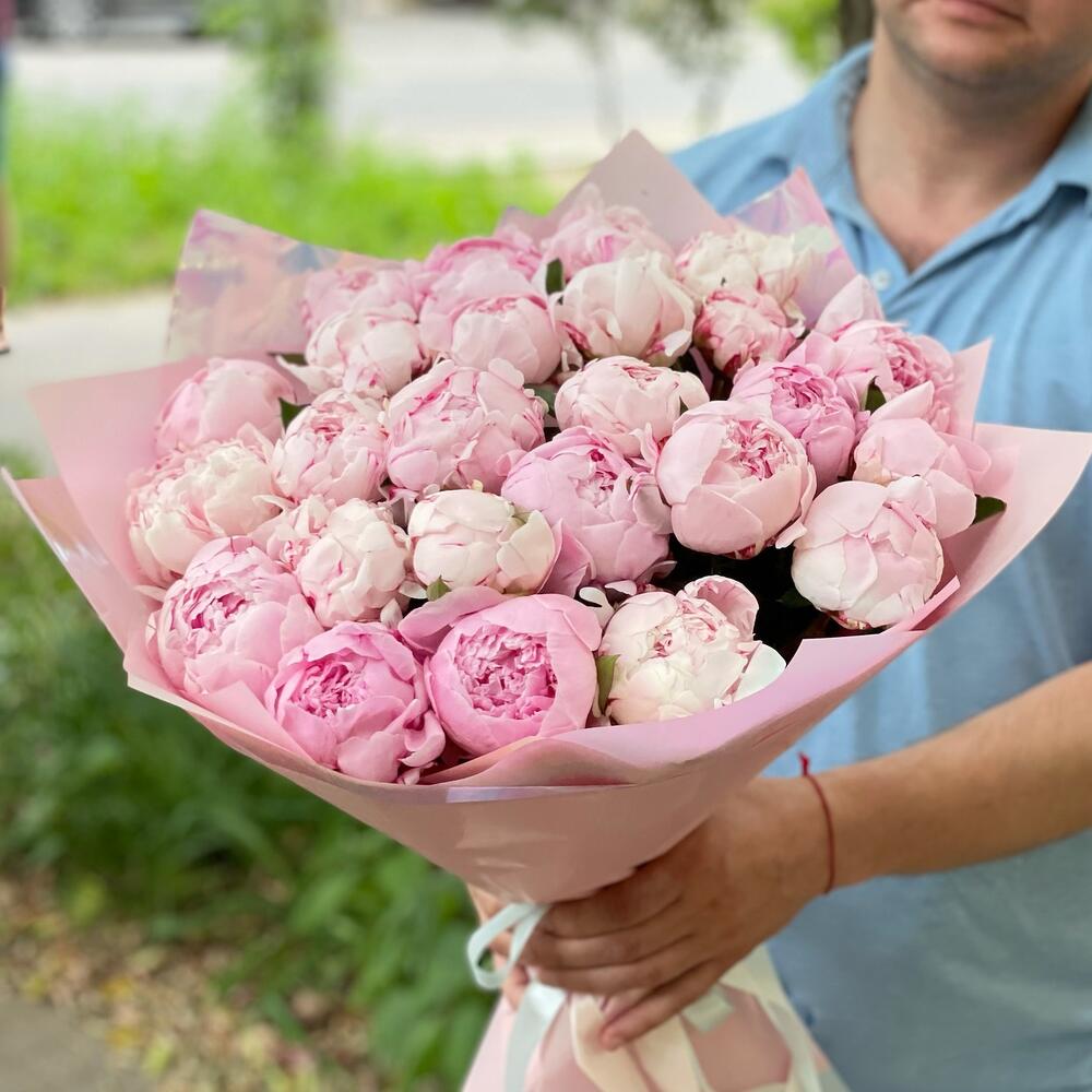 Лента атласная - 2 шт. Упаковка дизайнерская - 1 шт. пионы сара бернар - 25 шт.
