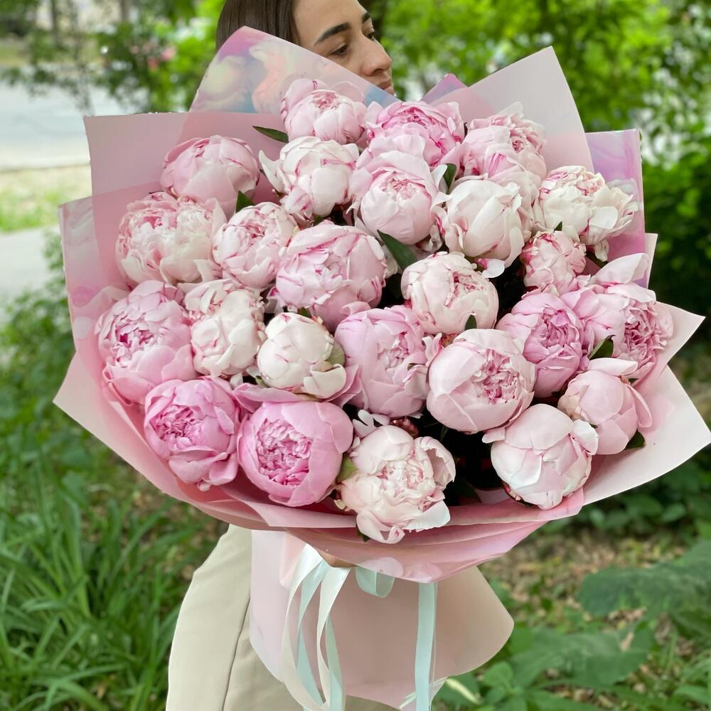 Лента атласная – 2 шт. Упаковка дизайнерская – 1 шт. пионы сара бернар – 25 шт.