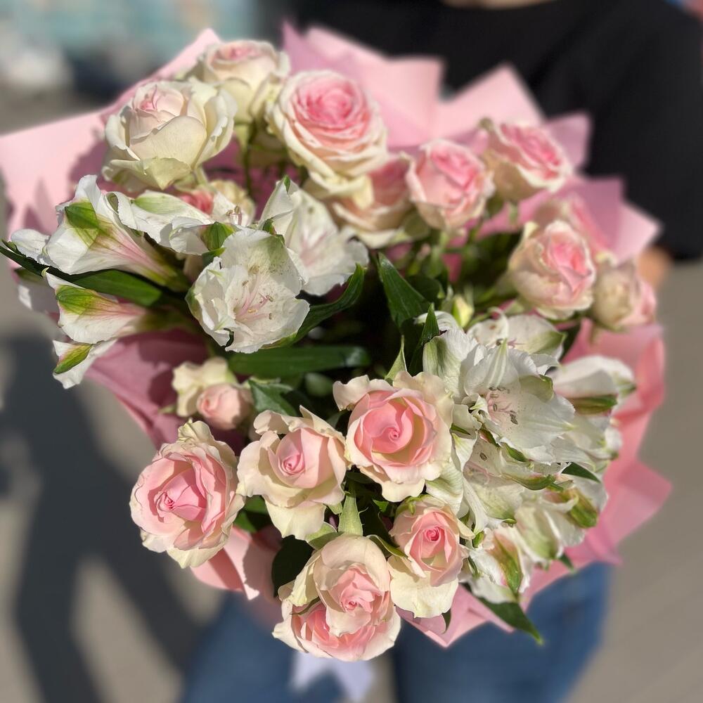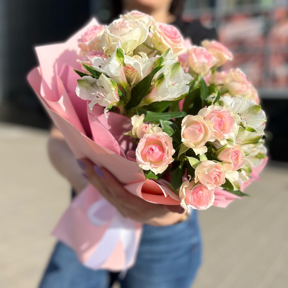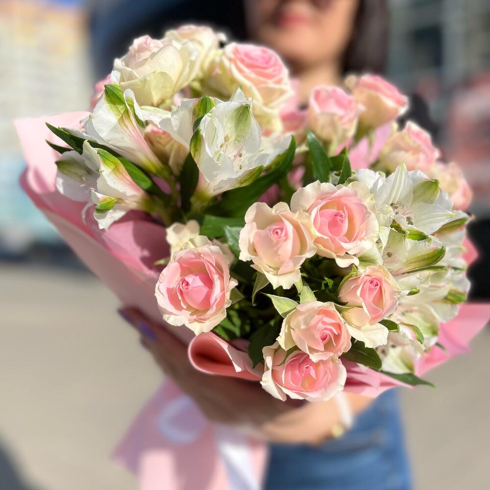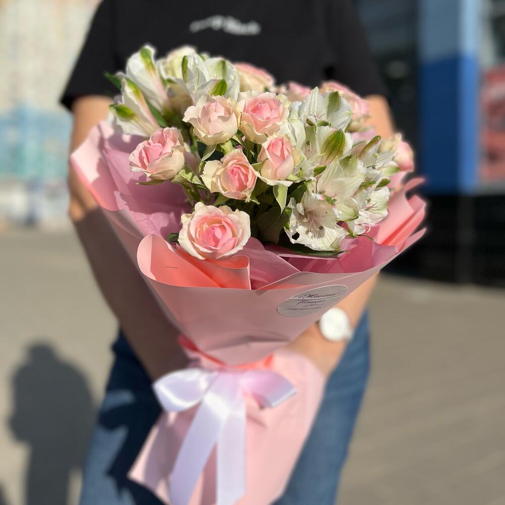 Альстромерия - 3 шт. Роза кустовая - 3 шт. Упаковка - 1 шт. Лента атласная - 1 шт. Тишью - 2 шт.