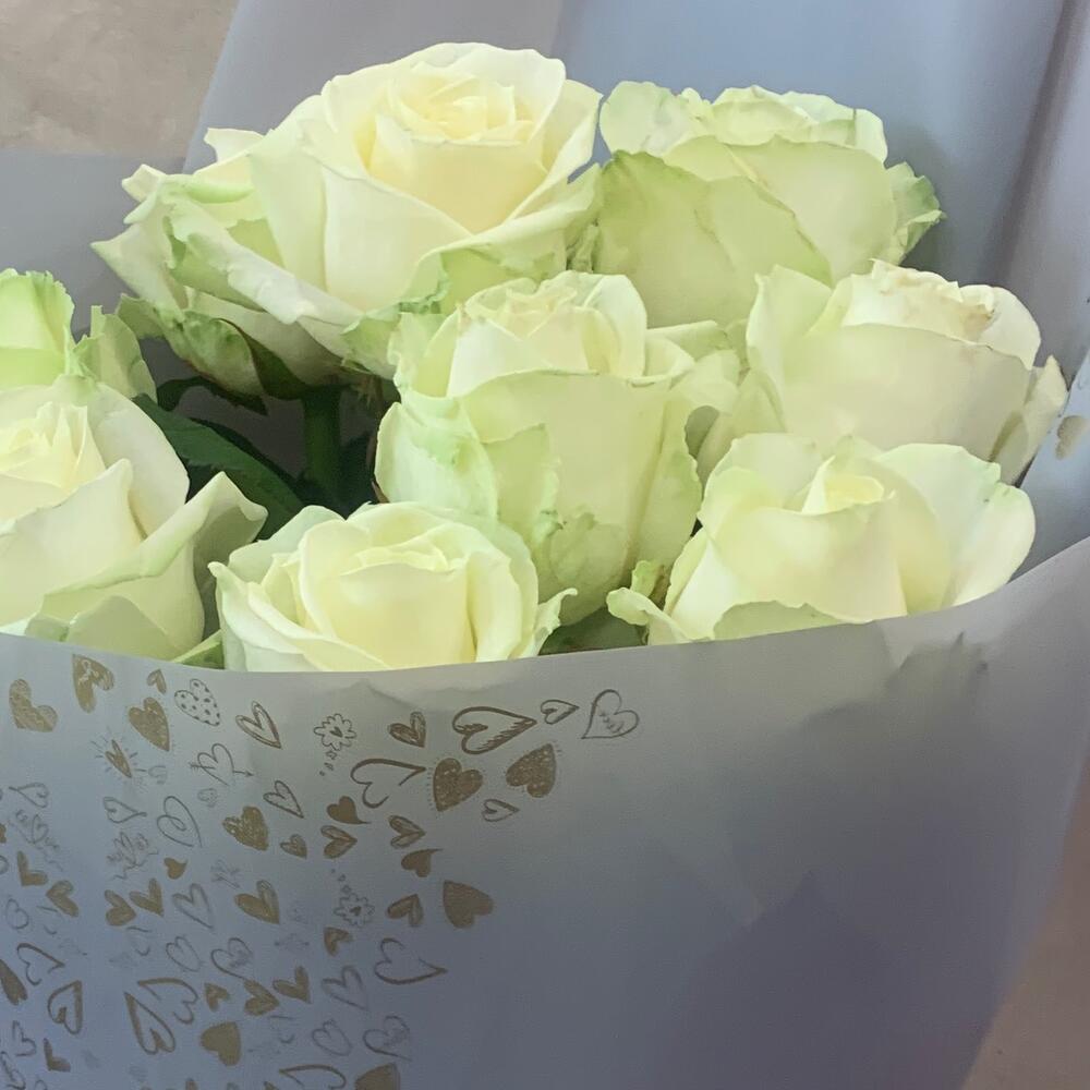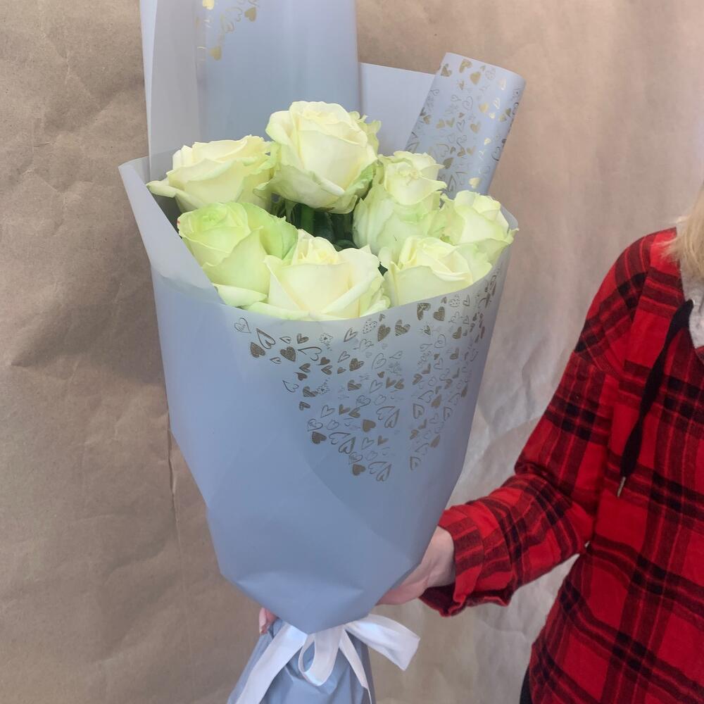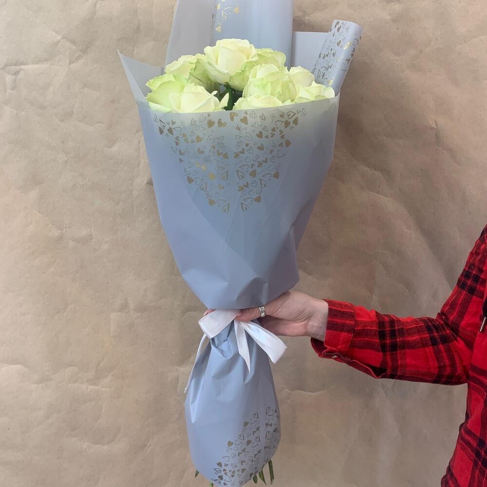 Лента атласная – 1 шт. Пленка матовая – 1 шт. Роза аваланж россия – 9 шт.