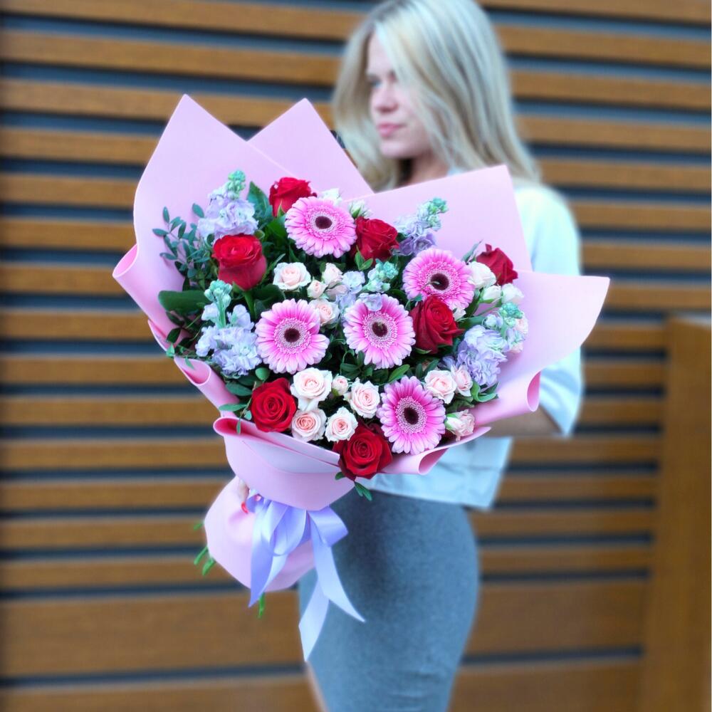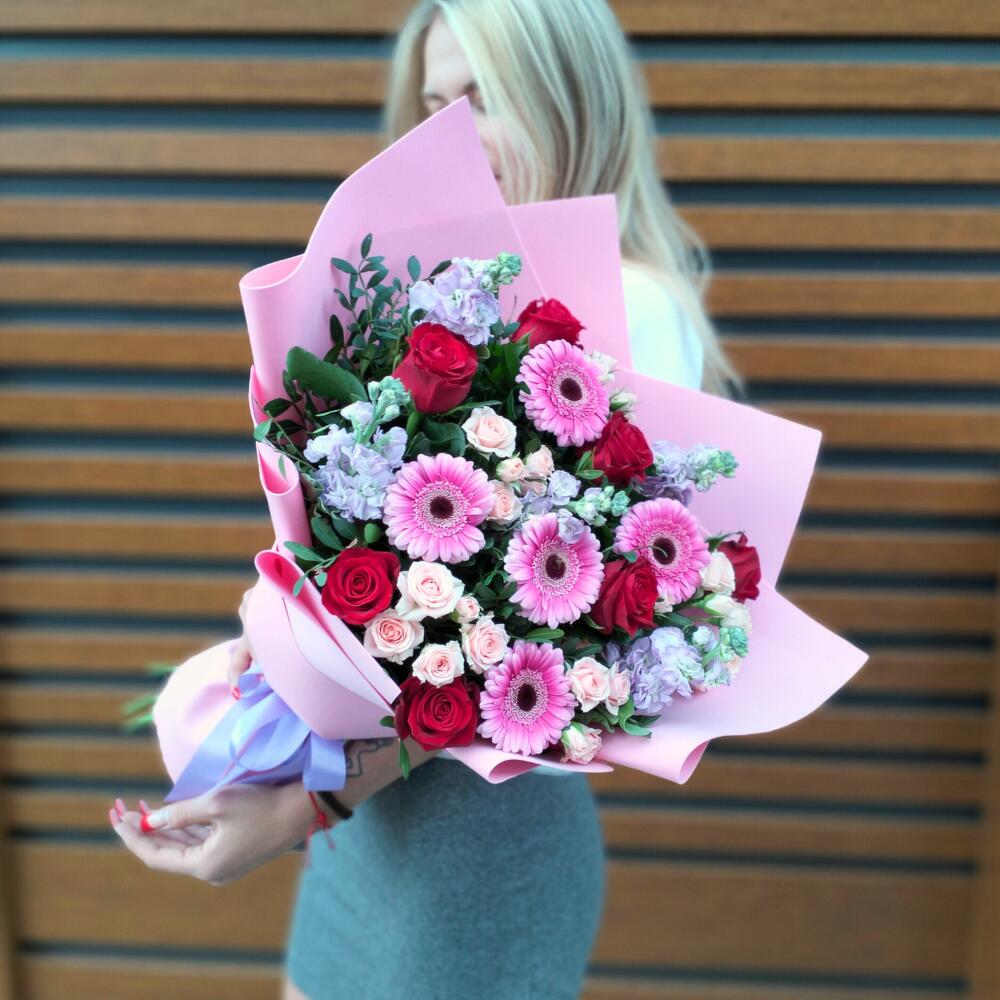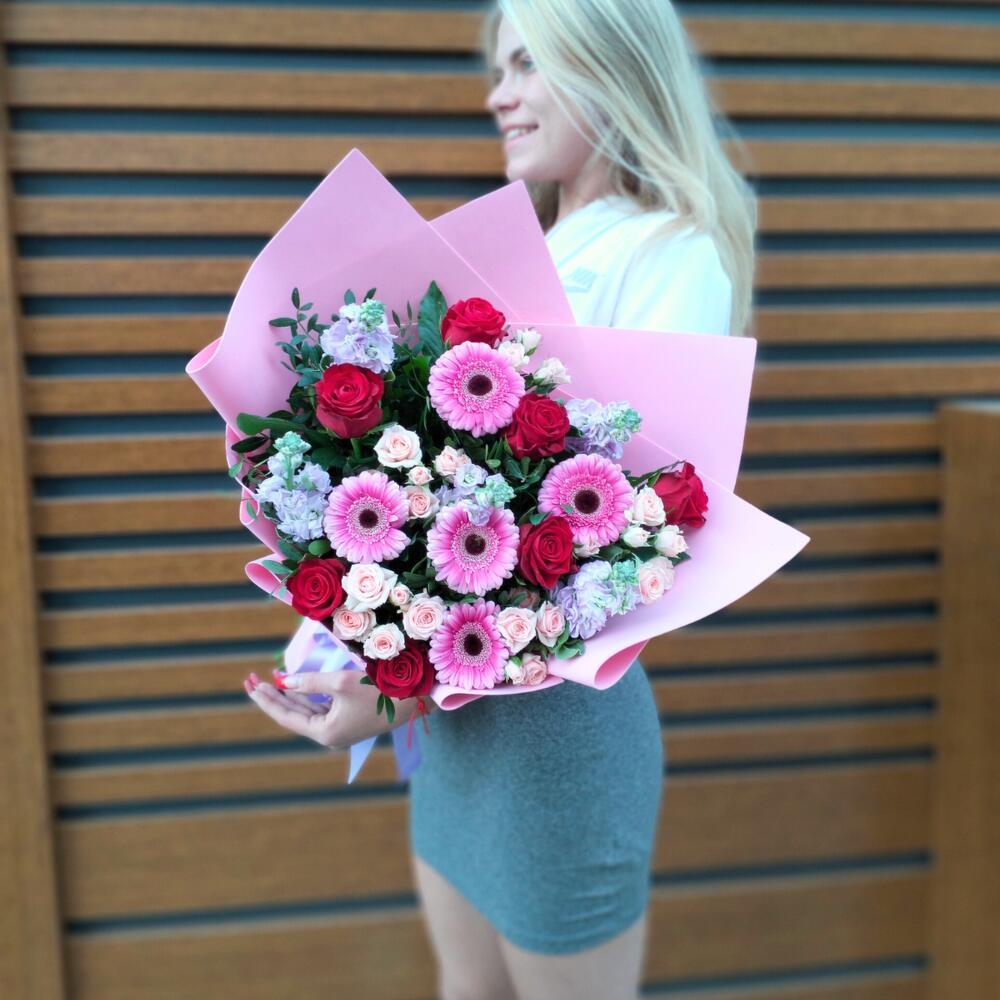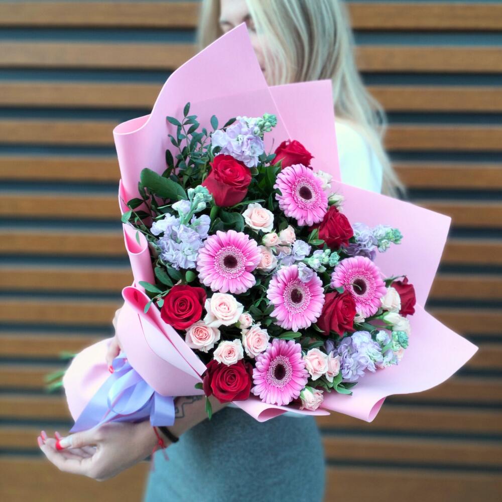 Лента – 2 шт. Маттиола – 5 шт. Роза – 7 шт. Кустовая роза – 5 шт. Гербера – 5 шт. Фисташка – 4 шт. Фоамиран – 2 шт.