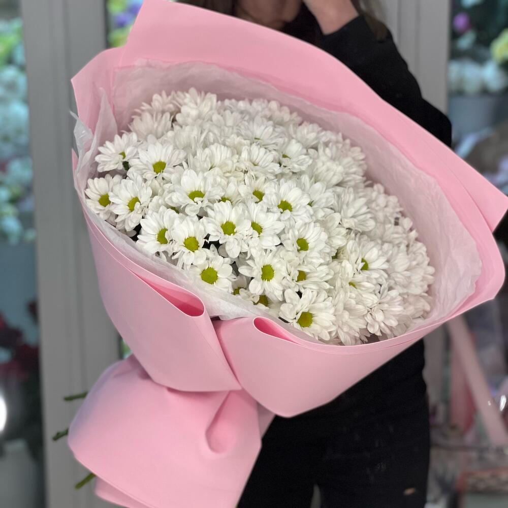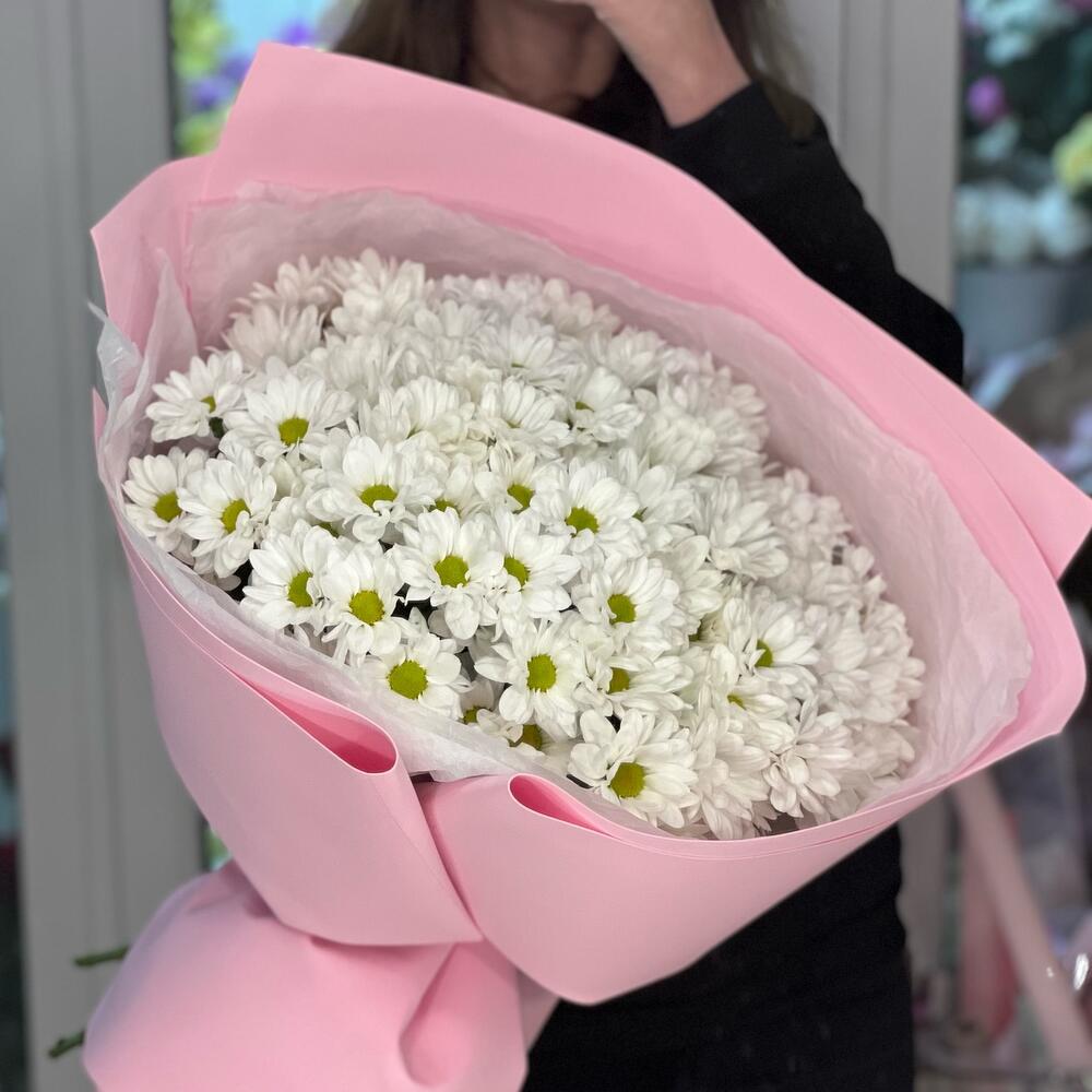 Хризантема кустовая - 15 шт. Средство для продления жизни цветов - 1 шт. Фоамиран (упаковка) - 4 шт. Бумага тишью - 3 шт.