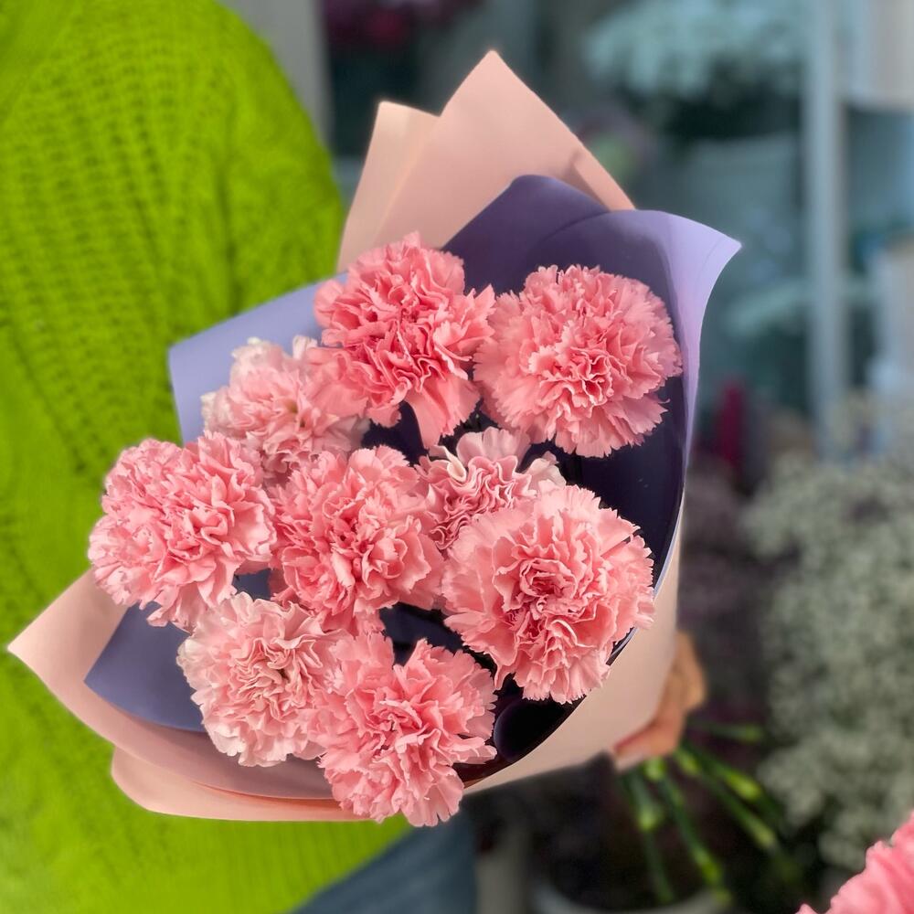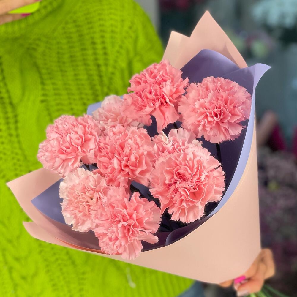 Гвоздика сортовая – 9 шт. Упаковка дизайнерская – 1 шт. Средство для продления жизни цветов – 1 шт.