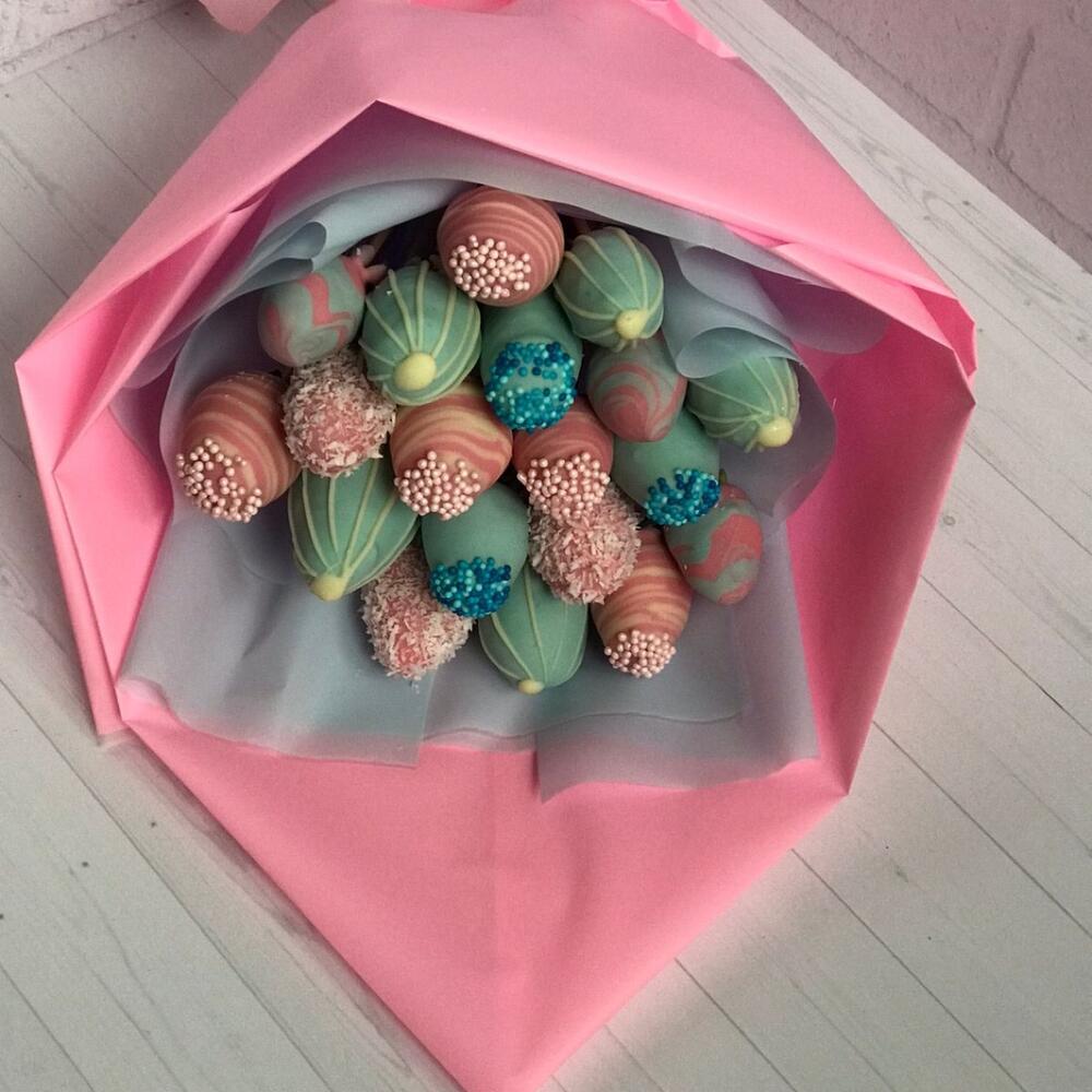Лента атласная – 1 шт. Упаковка дизайнерская – 3 шт. Клубника в шоколаде callebaut (бельгия) – 19 шт.