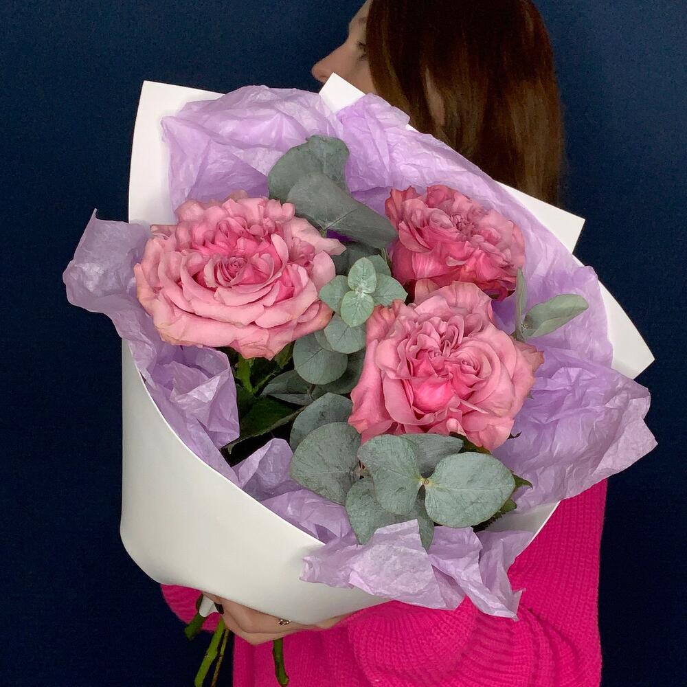 Эвкалипт – 2 шт. Средство для продления жизни цветов – 1 шт. Дизайнерская упаковка – 1 шт. Бумага тишью – 2 шт. роза кантри блю – 3 шт.