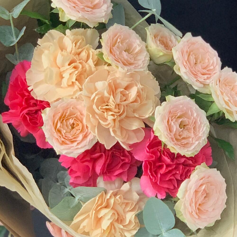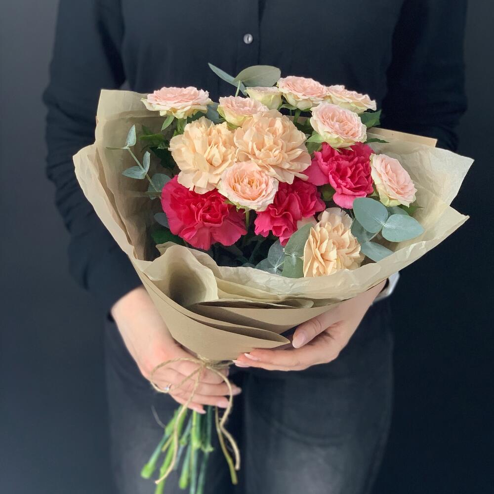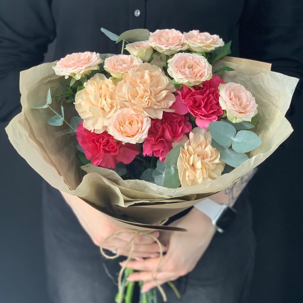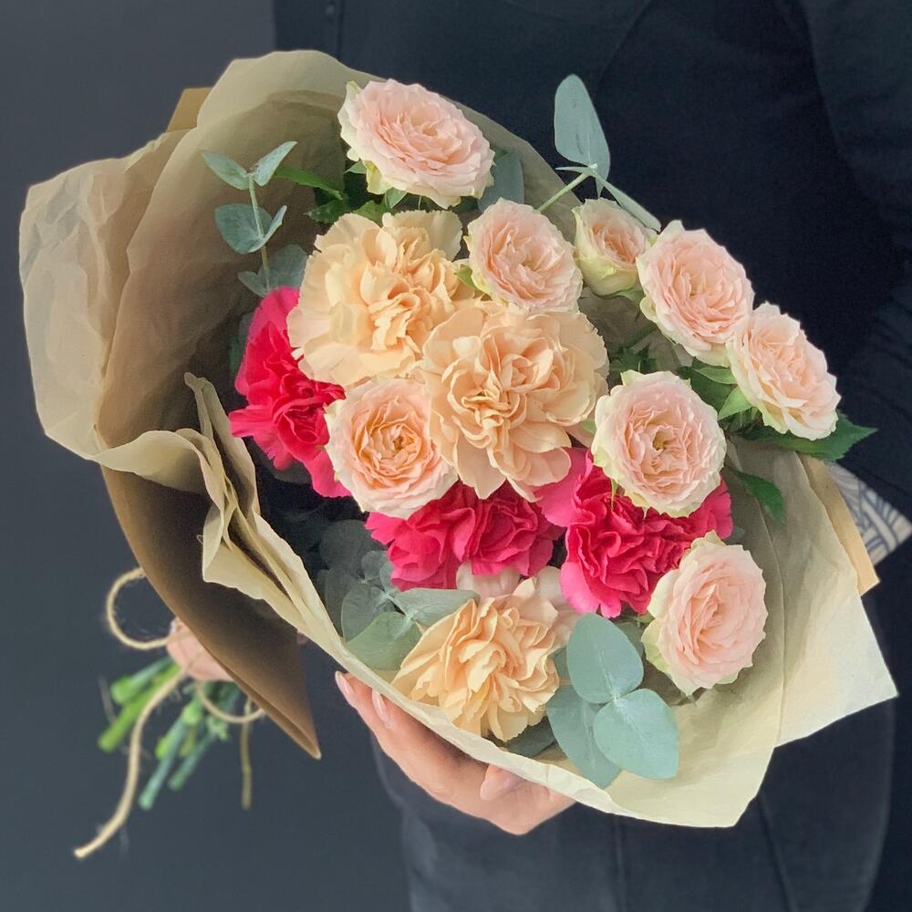Нежный букет с персиковым и малиновым диантусом, кустовой розой и эвкалиптом 🌿Чтобы букет дольше радовал получателя, вместе с букетом мы отправляем подробную инструкцию и средство по уходу. Букеты доставляем на воде в транспортировочной крафтовой коробке 🫶🏻
