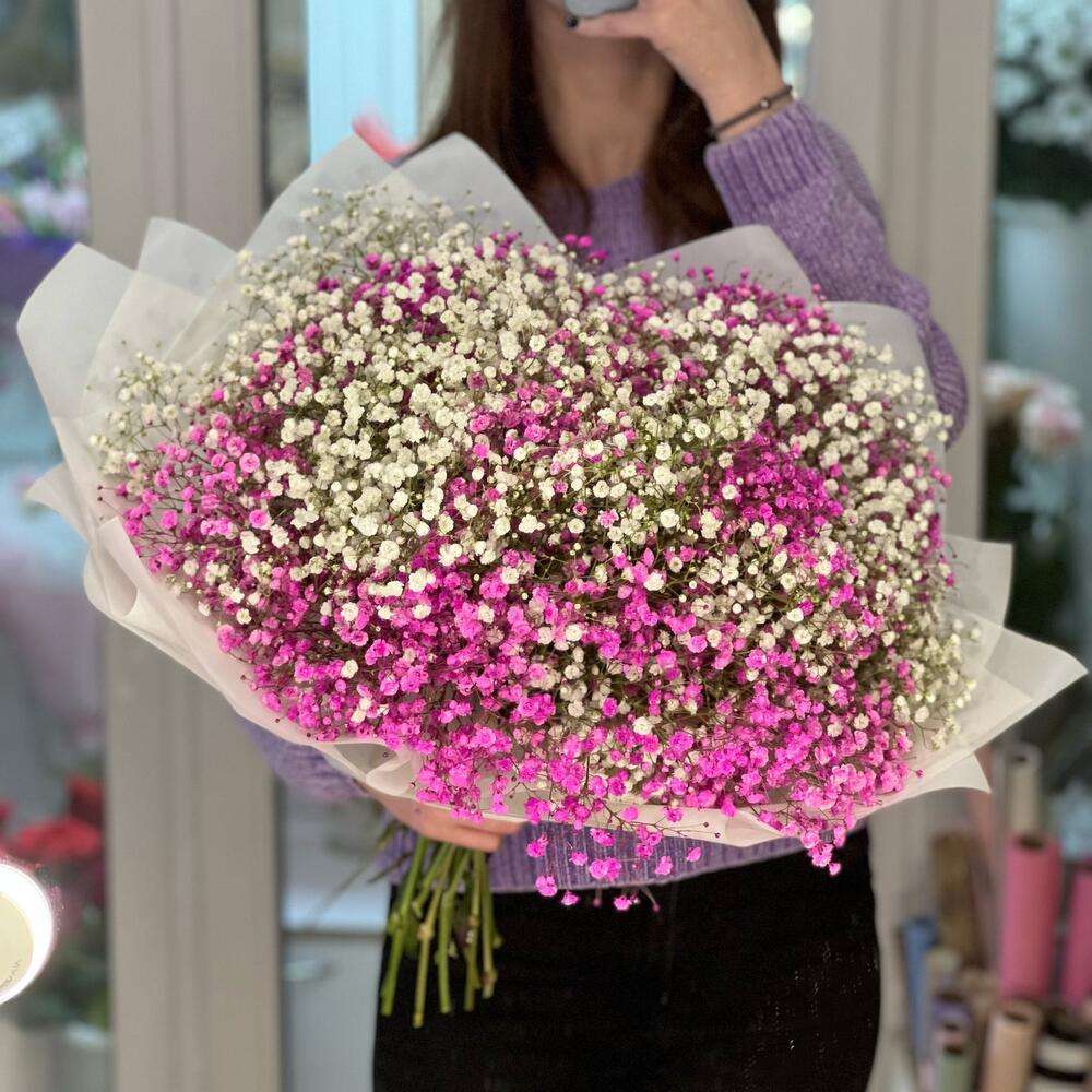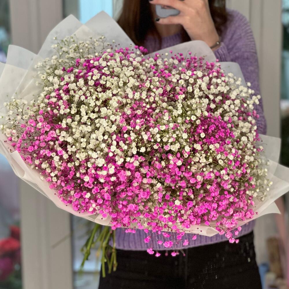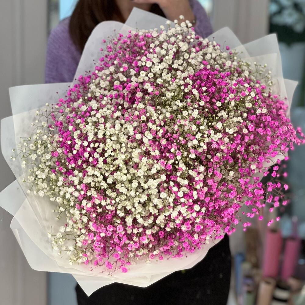 Гипсофила - 15 шт. Средство для продления жизни цветов - 1 шт. Дизайнерская упаковка - 1 шт. Бумага тишью - 4 шт.