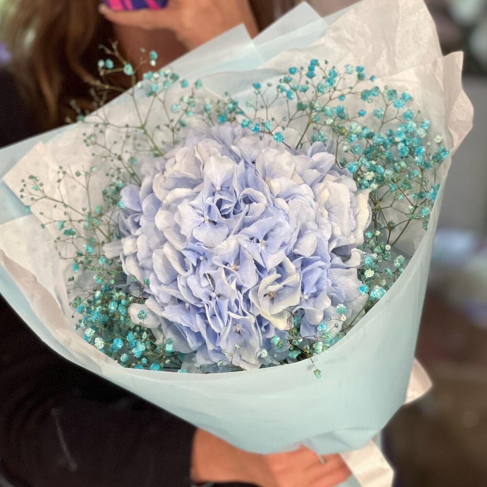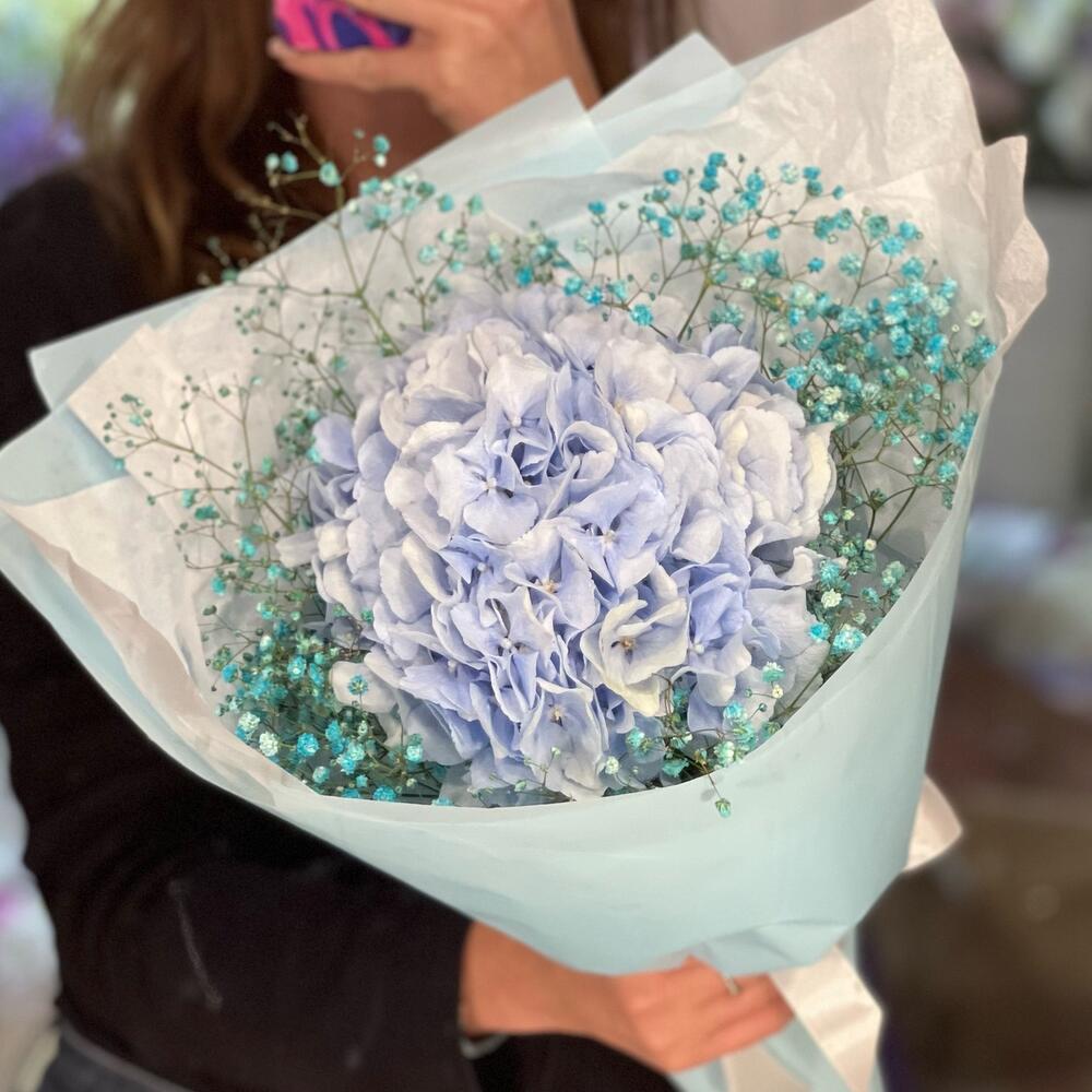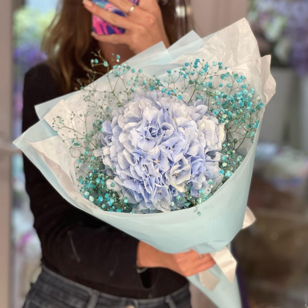 Букет с голубой гортензией и гипсофилой