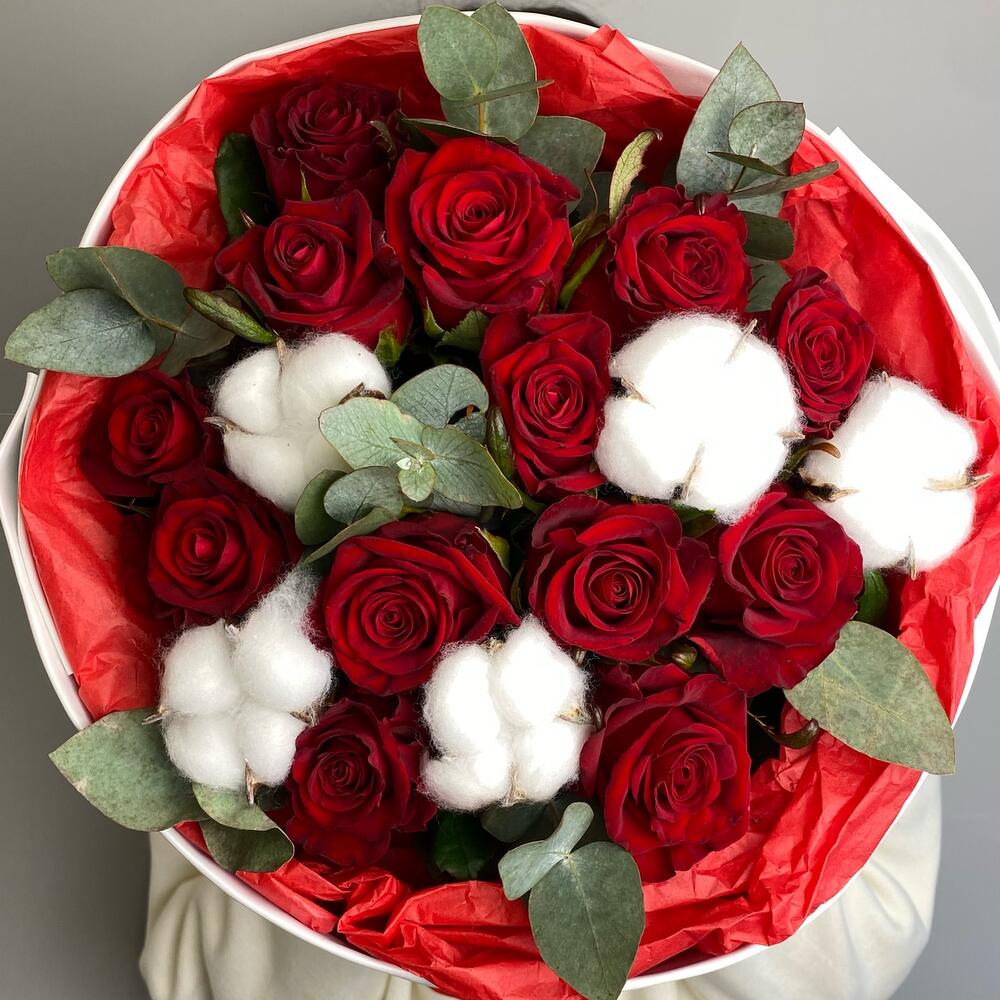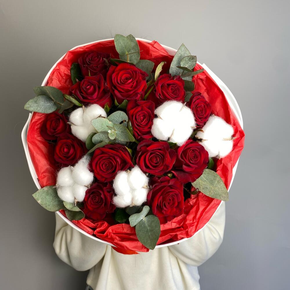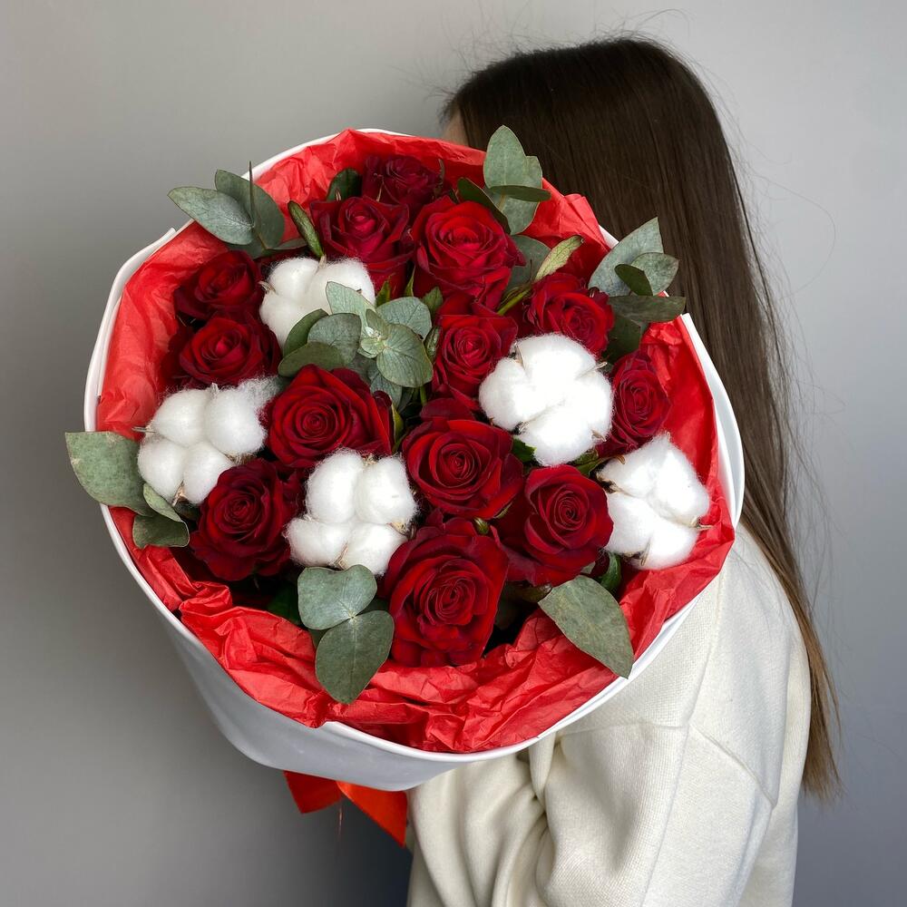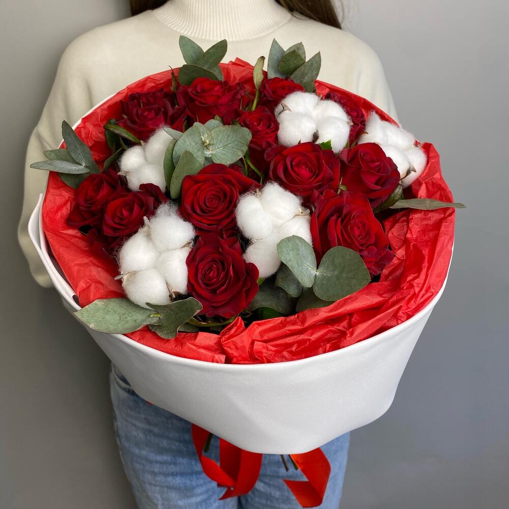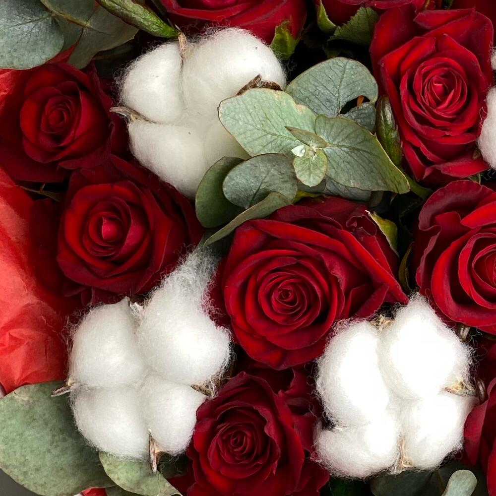 Букет с красными розами, эвкалиптом и хлопком