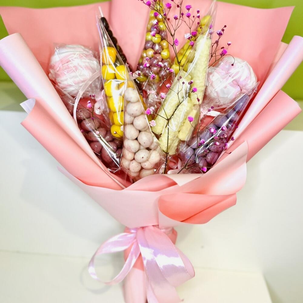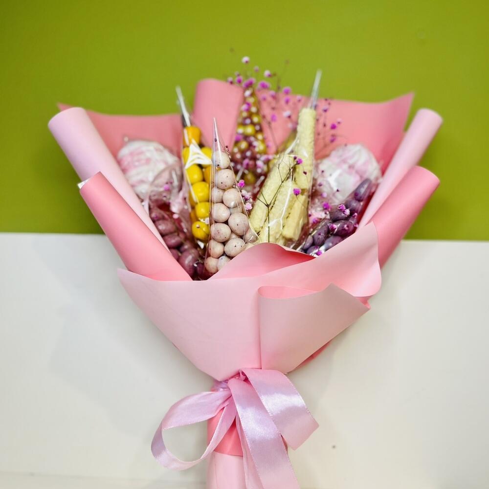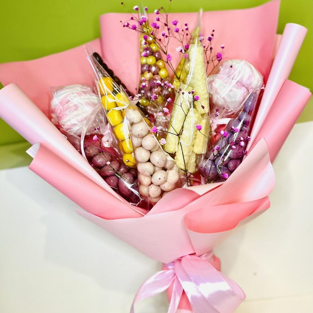 Зефир - 2 шт. Вафли в шоколаде - 60 гр. Фундук в шоколаде - 60 гр. Ананас в шоколаде - 60 гр. воздушный рис - 60 гр. миндаль в шоколаде - 60 гр. арахис в шоколаде - 60 гр. кешью в шоколаде - 60 гр. гипсофилп крашенная - 1 шт. кокосовые палочки - 60 гр.
