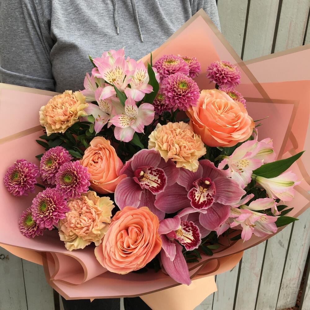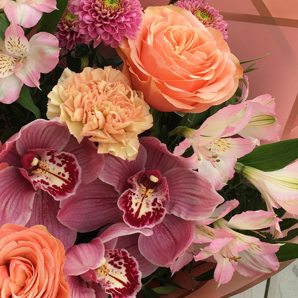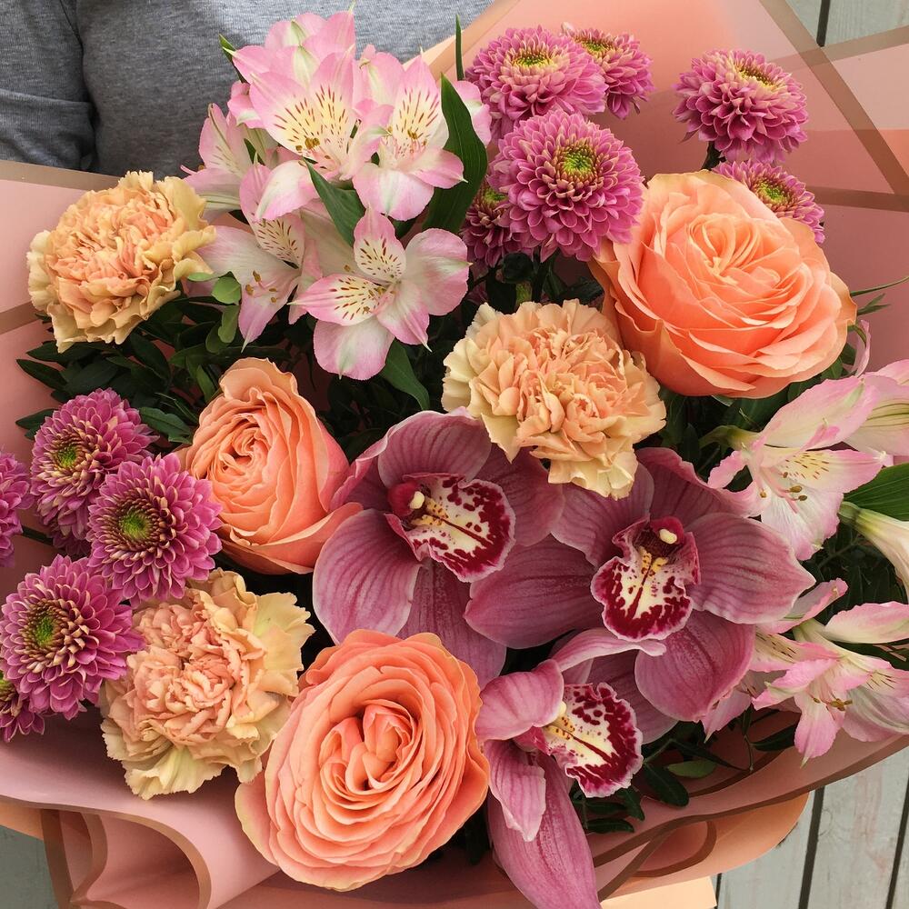 Букет с пионовидными розами сорта “Кахала”, орхидеей Цимбидиум, потрясающими кремовыми гвоздиками, в дополнении с хризантемами и альстромериями, станет приятным подарком как близкому человеку так и коллеге. Благодаря сдержанной цветовой гамме— букет стильный и лаконичный, в нём нет ничего лишнего.Орхидея Цимбидиум обладает приятным сладким ароматом.Такой букет, в основном, содержит стойкие цветы, чтобы радовать получателя как можно дольше. Уход за букетом:-чистая ваза(обязательно мыть с хлоросодержащим веществом) -холодная вода-перед постановкой в воду обязательно обновить срез ножом или секатором-менять воду не реже 1 раза в 2 дня.