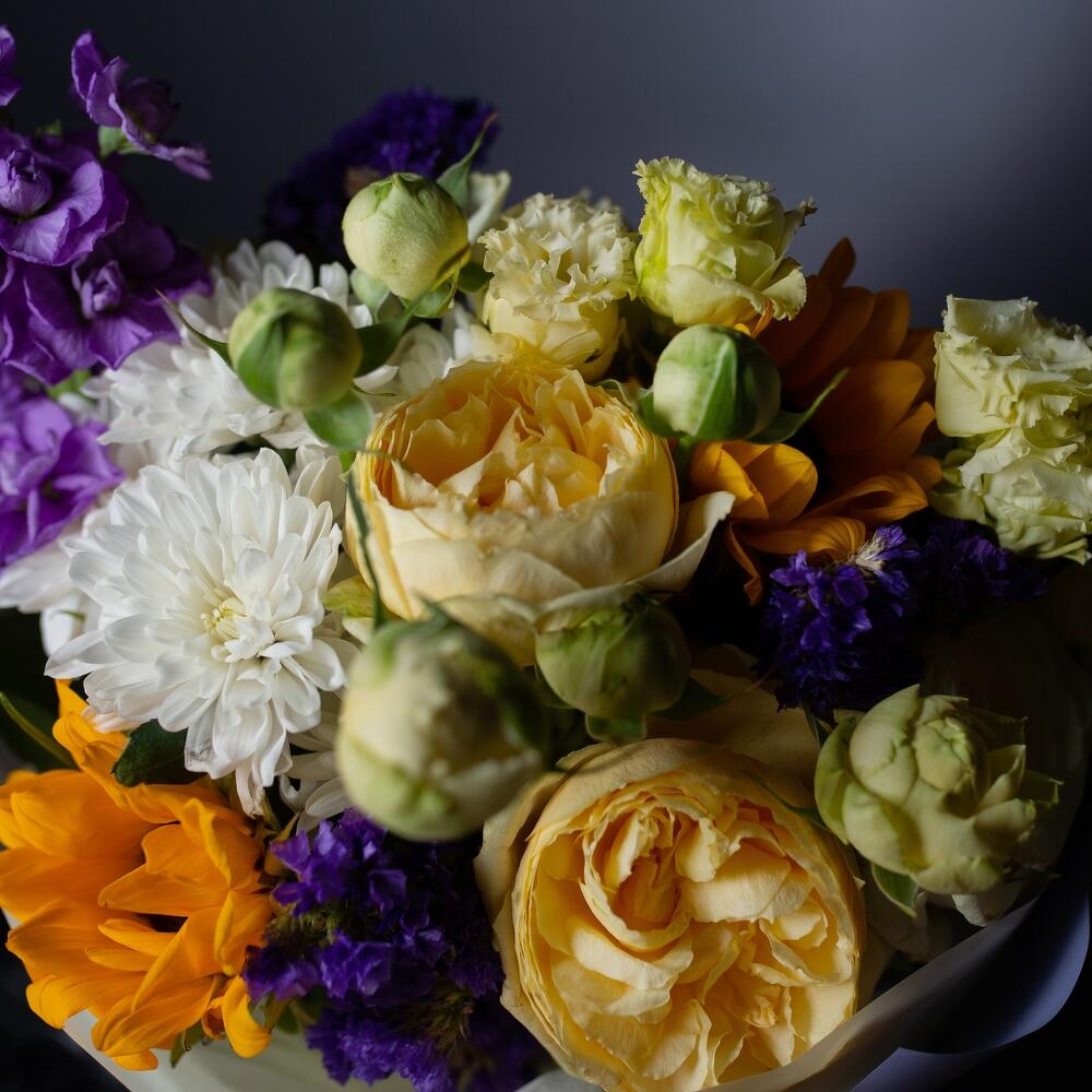 Маттиола – 1 шт. Хризантема кустовая – 1 шт. Эустома – 2 шт. Роза Россия – 1 шт. Кустовая пионовидная роза – 1 шт. Упаковка дизайнерская – 1 шт. подсолнух (гелиантус) – 2 шт.