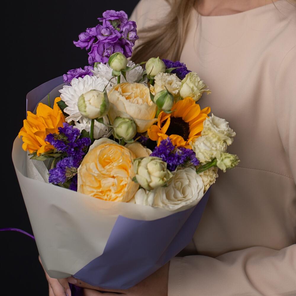 Маттиола - 1 шт. Хризантема кустовая - 1 шт. Эустома - 2 шт. Роза Россия - 1 шт. Кустовая пионовидная роза - 1 шт. Упаковка дизайнерская - 1 шт. подсолнух (гелиантус) - 2 шт.