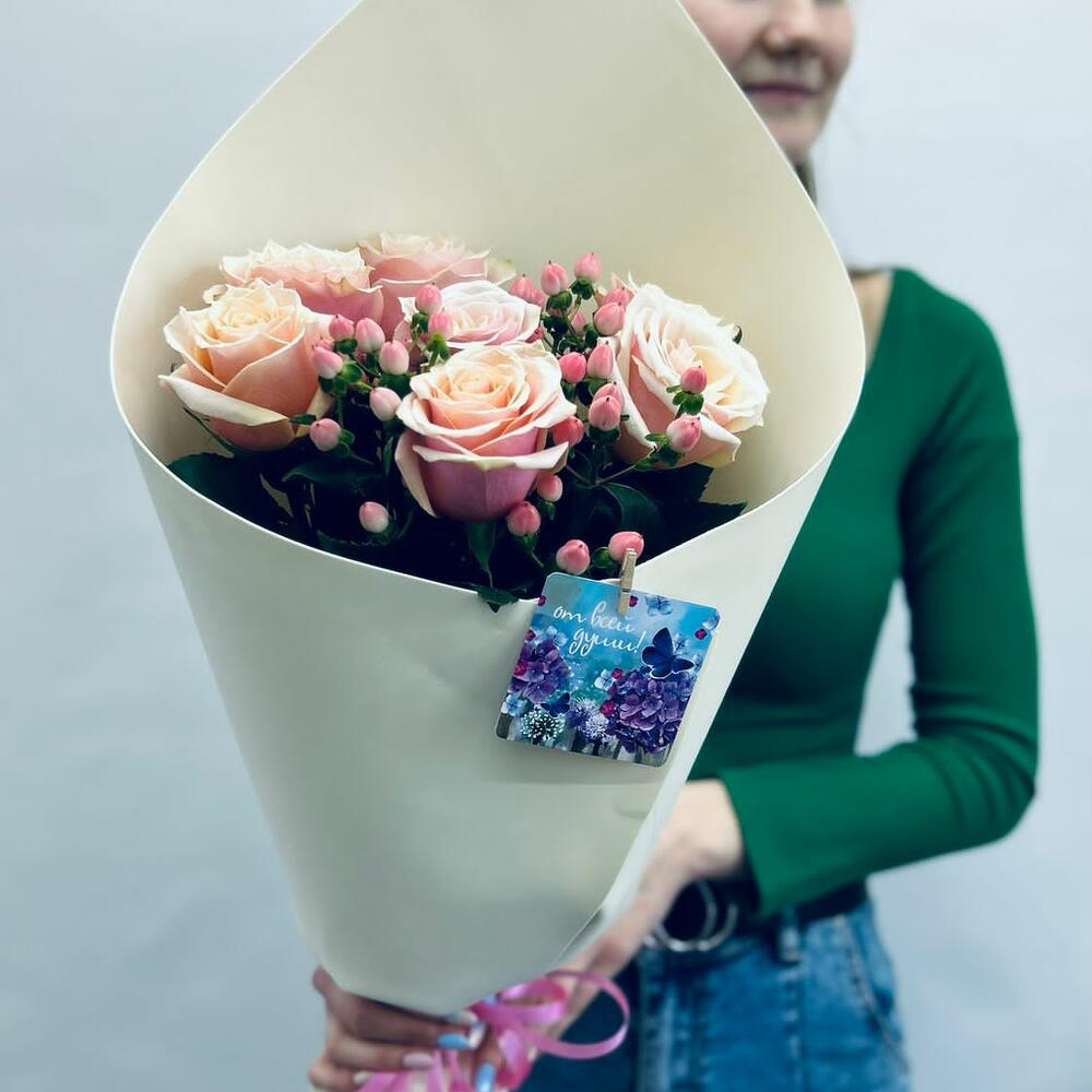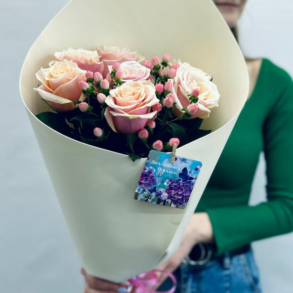 Букет с розами «Дуэт». Нежные розы в сочетании с гиперикумом. Красивый и стильный букет.В зависимости от поставок цветов мы можем обговаривать различные оформления цветовой гаммы с менеджером.