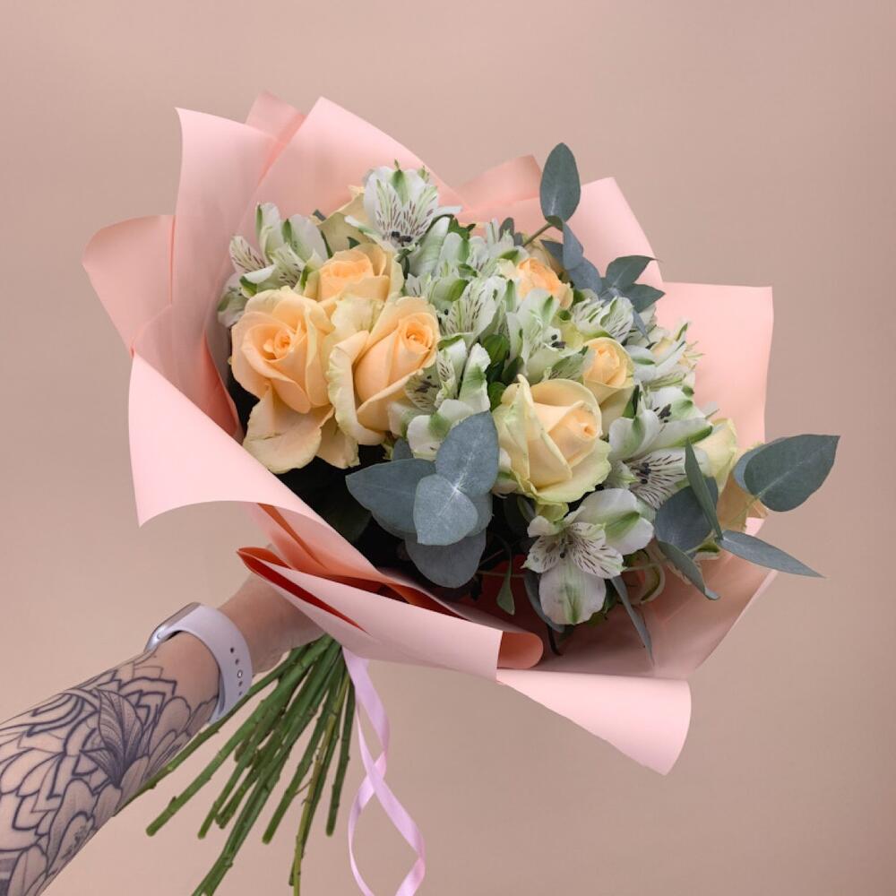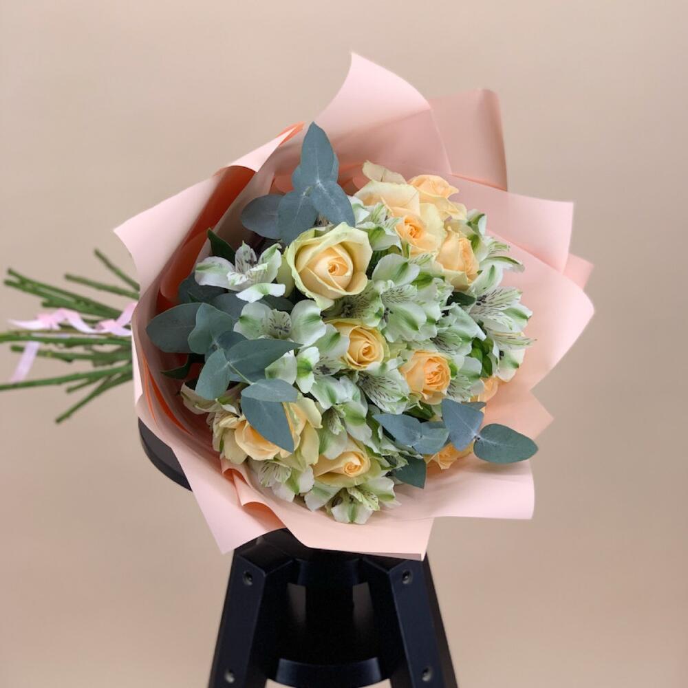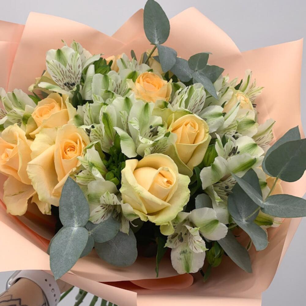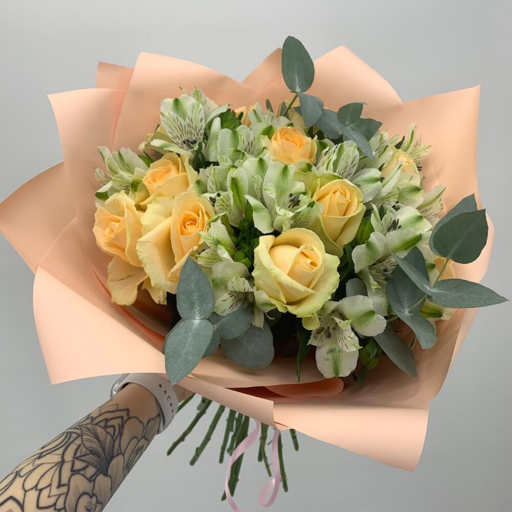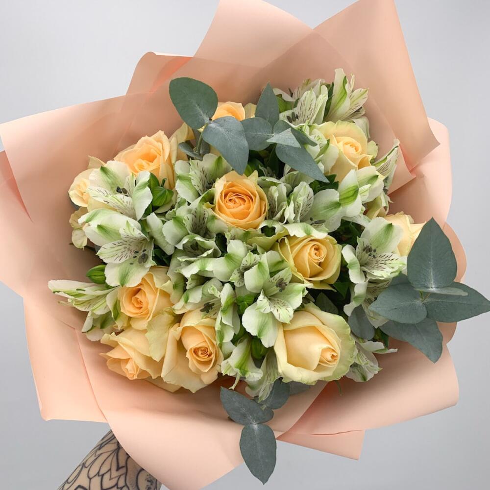 Альстромерия - 8 шт. Эвкалипт - 2 шт. Роза - 11 шт. Упаковка - 1 шт.