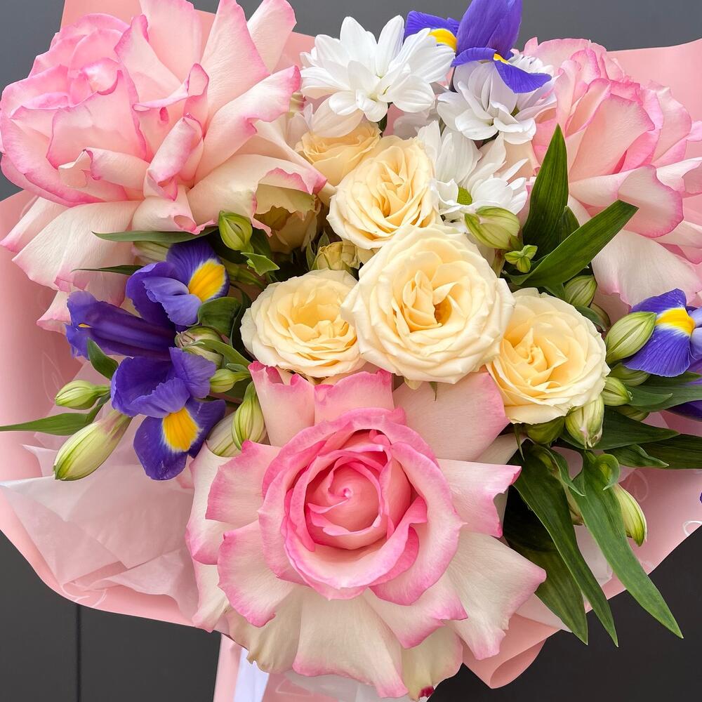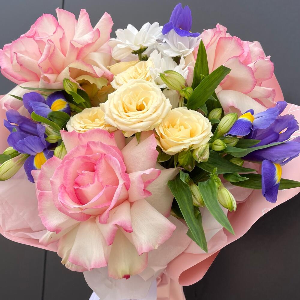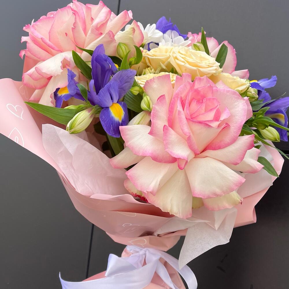 Роза кустовая – 1 шт. Роза – 3 шт. Упаковка дизайнерская – 2 шт. Ирис Blue Magic – 3 шт.