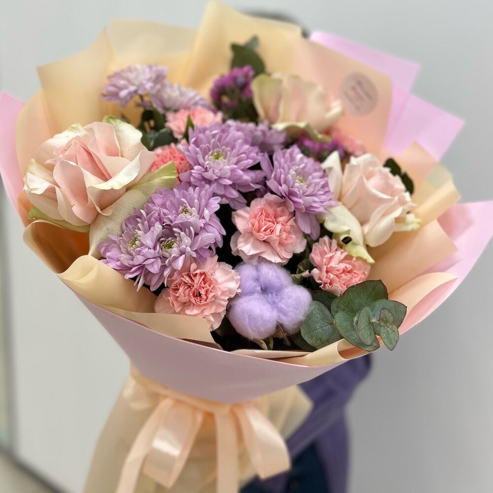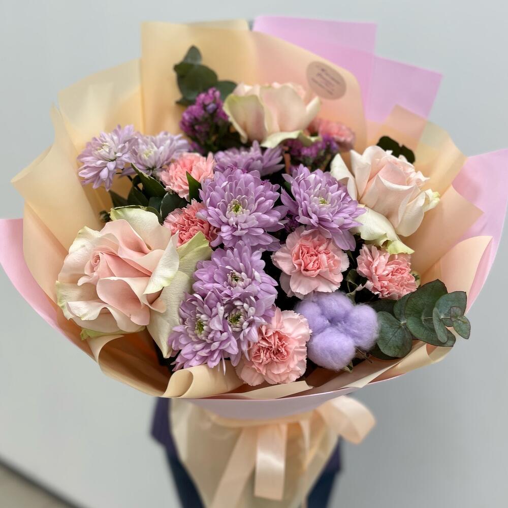 Лента – 1 шт. Статица – 2 шт. Хлопок – 1 шт. Хризантема кустовая – 3 шт. Роза – 3 шт. Упаковка – 2 шт. Диантус – 5 шт. эакалип – 1 шт.
