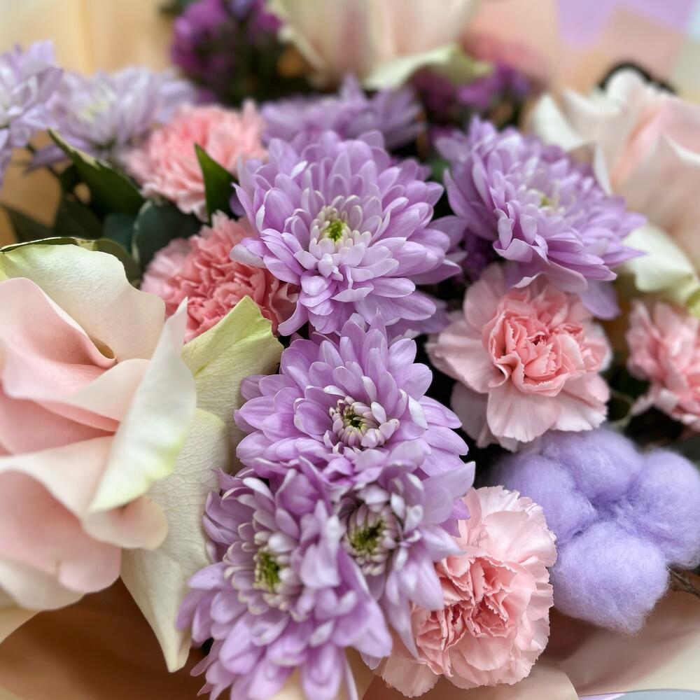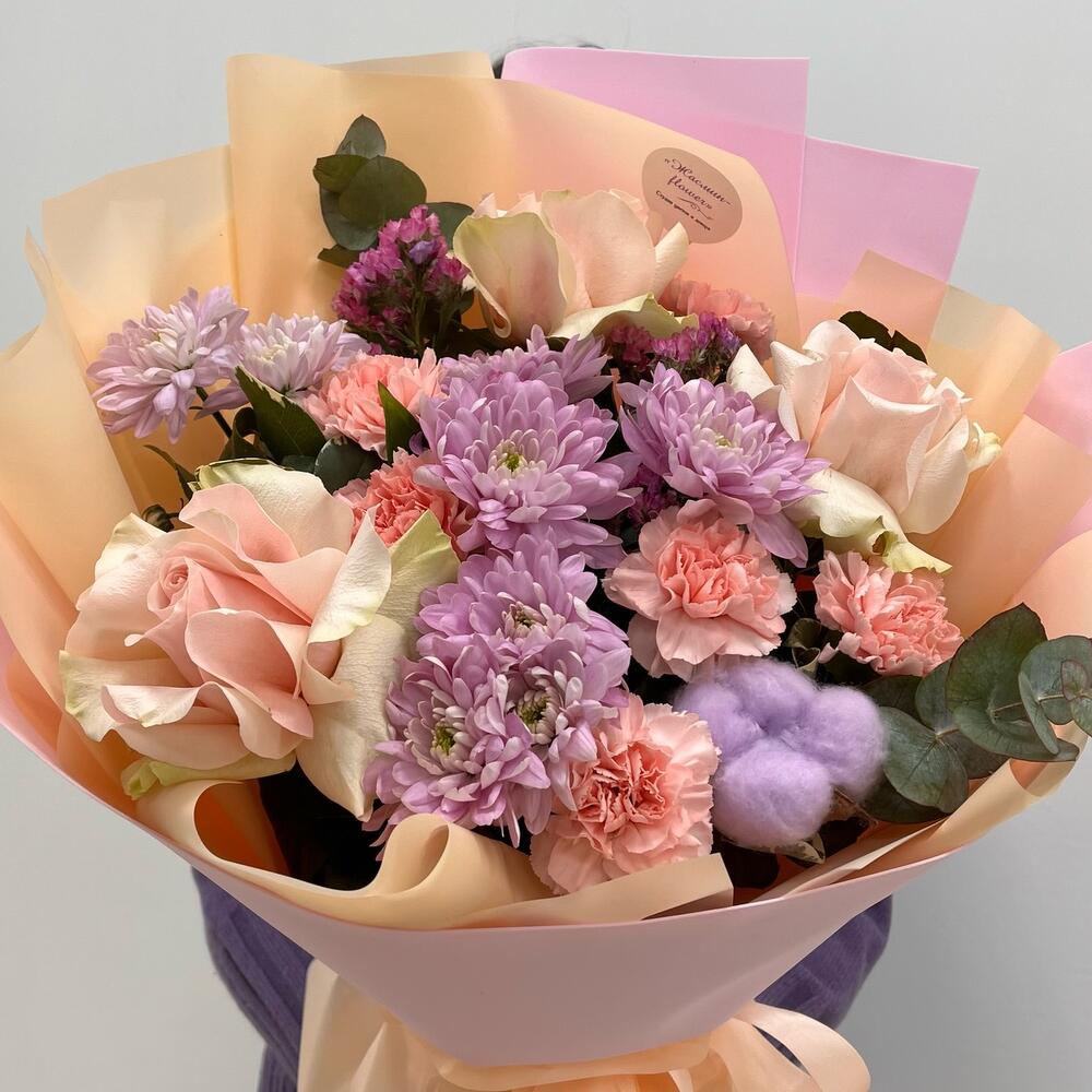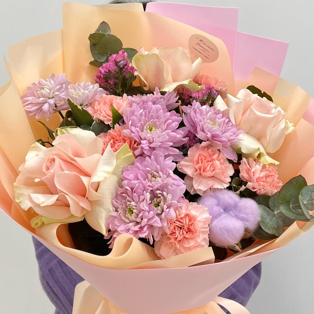 Лента - 1 шт. Статица - 2 шт. Хлопок - 1 шт. Хризантема кустовая - 3 шт. Роза - 3 шт. Упаковка - 2 шт. Диантус - 5 шт. эакалип - 1 шт.