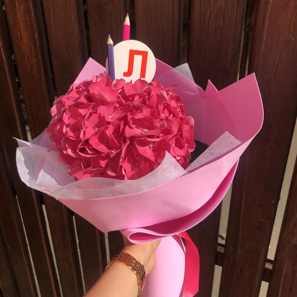 Стильный букет из гортензии с карандашами станет отличным презентом педагогу и учителю