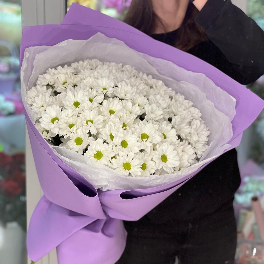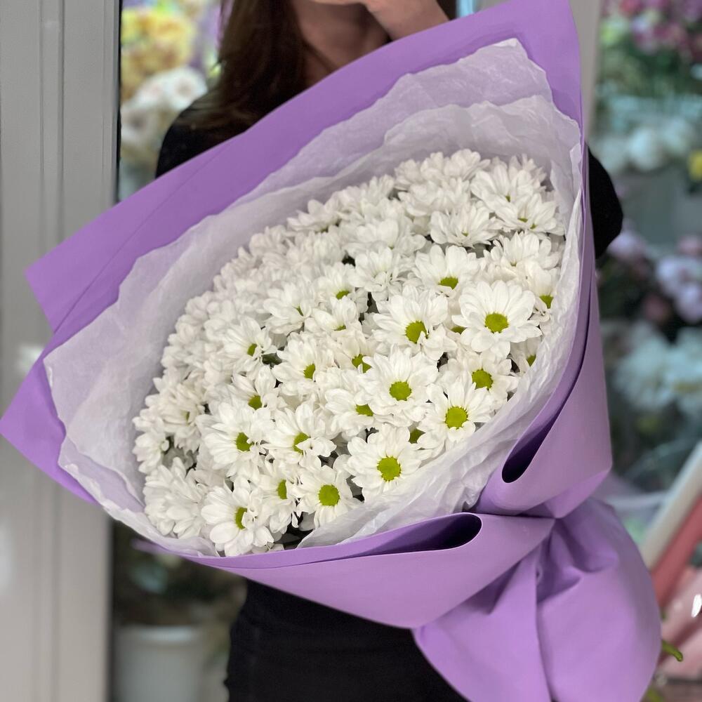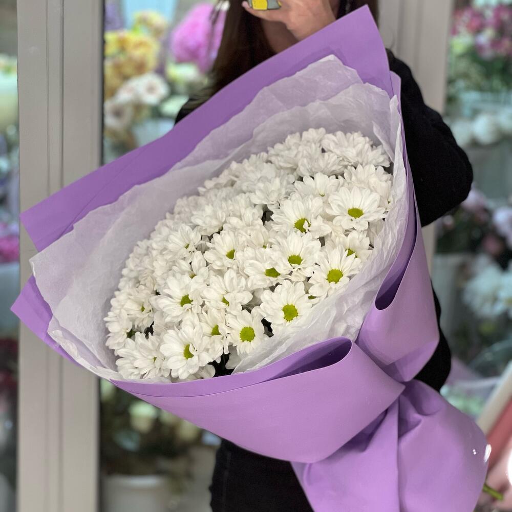 Хризантема кустовая - 15 шт. Средство для продления жизни цветов - 1 шт. Фоамиран (упаковка) - 4 шт. Бумага тишью - 3 шт.