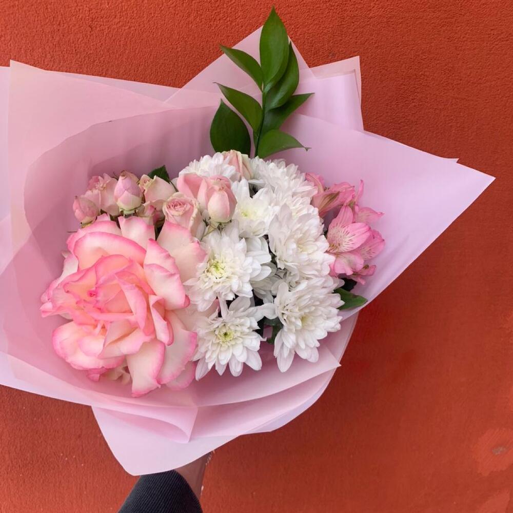 Альстромерия – 1 шт. Роза кустовая – 1 шт. Рускус – 1 шт. Хризантема кустовая – 2 шт. Упаковка – 1 шт. роза «софи лорен» – 1 шт.