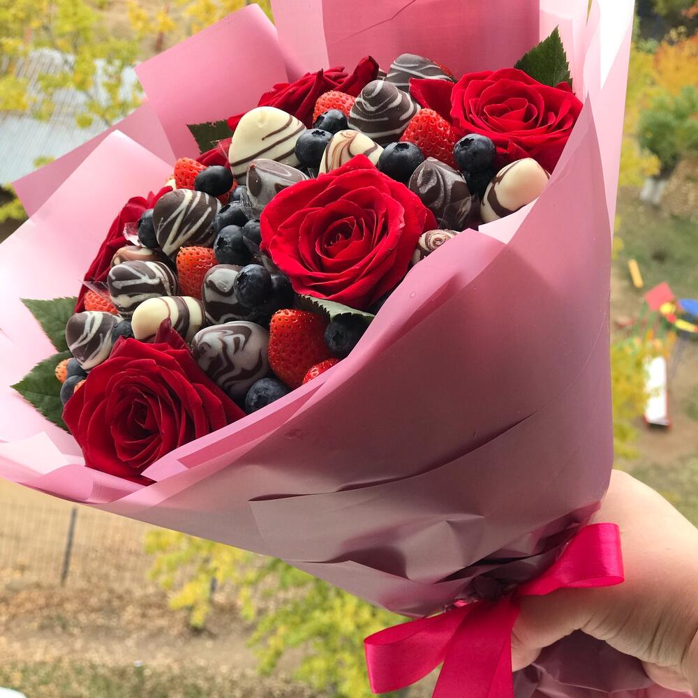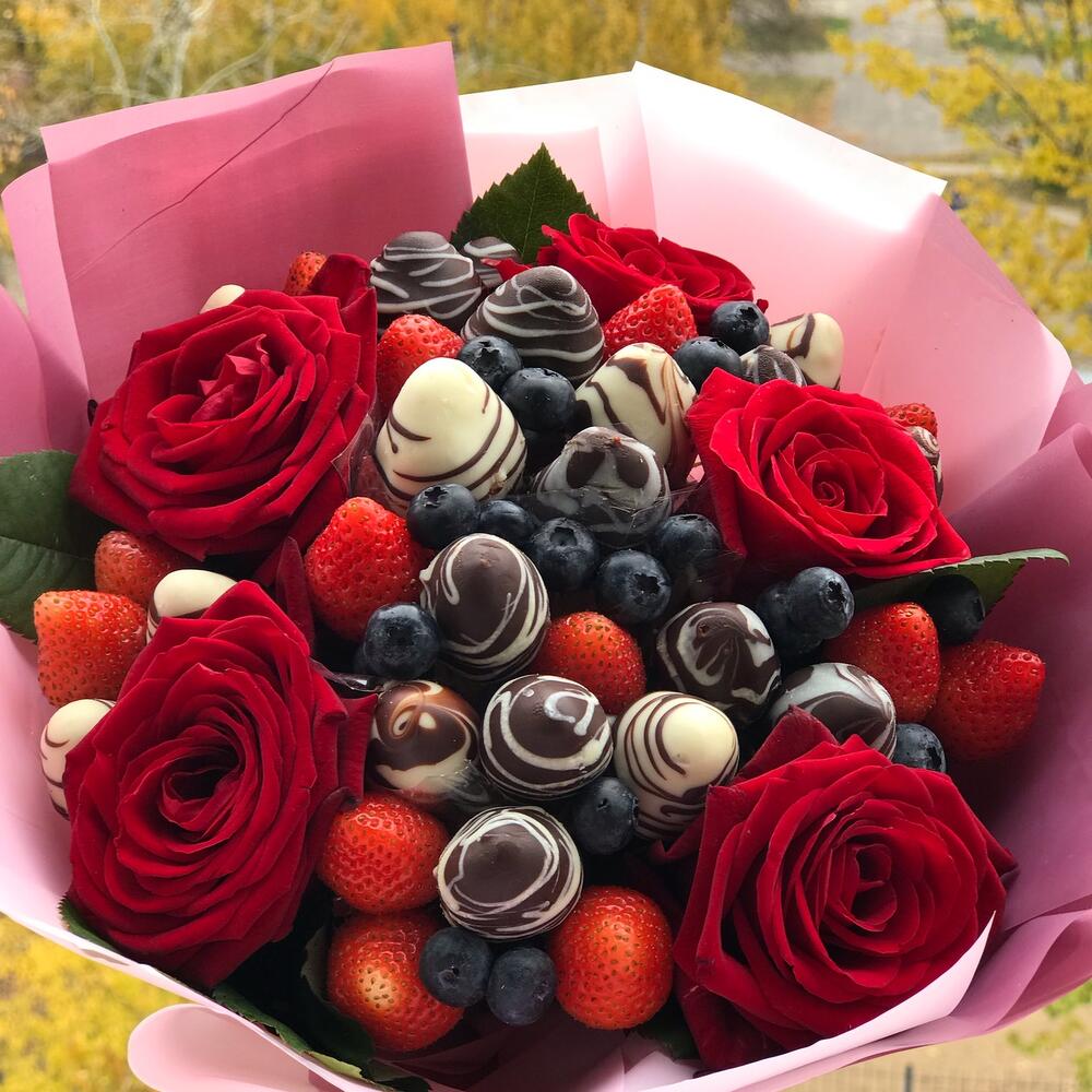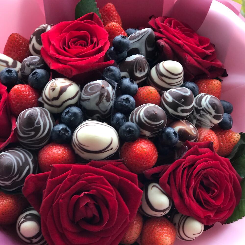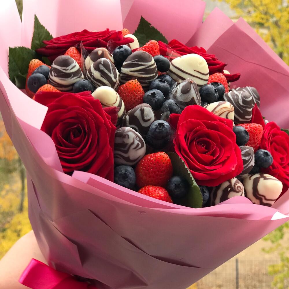 Букет из отборных ягод свежей клубники, клубники в бархатном бельгийском шоколаде с ароматными розами…WoW эффект гарантирован!