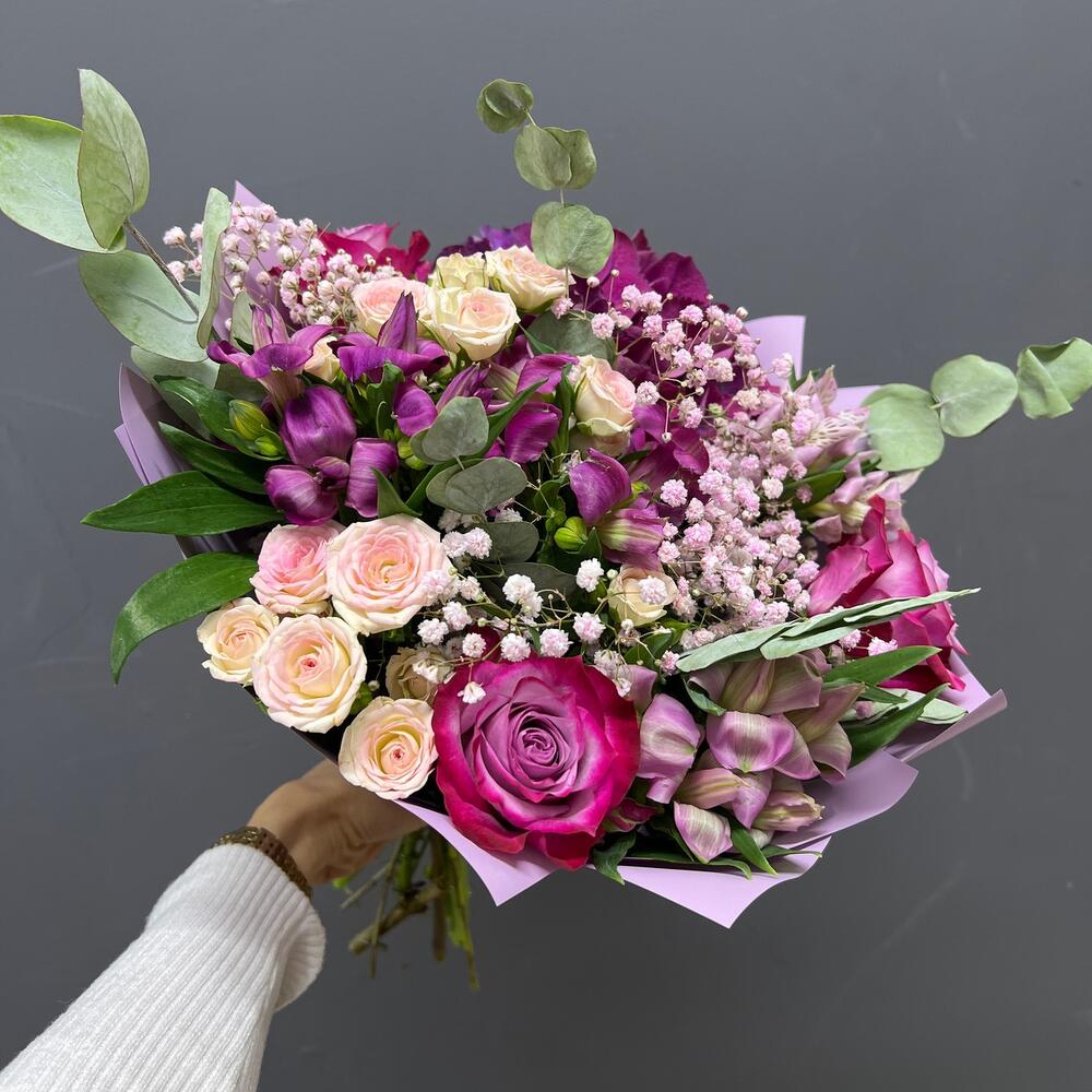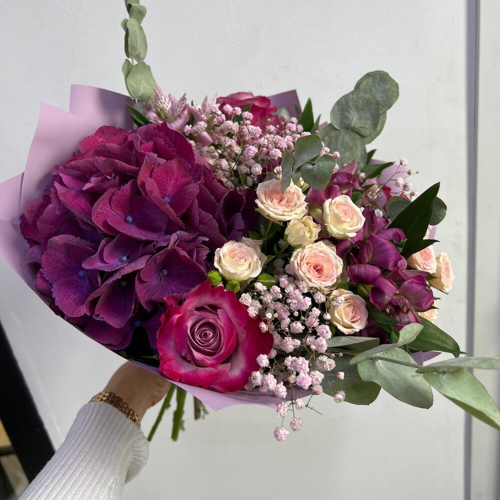 Альстромерия - 4 шт. Гипсофила - 1 шт. Гортензия - 1 шт. Эвкалипт - 1 шт. Роза - 3 шт. Кустовая роза - 2 шт. Лента атласная - 1 шт. Пленка матовая - 1 шт.