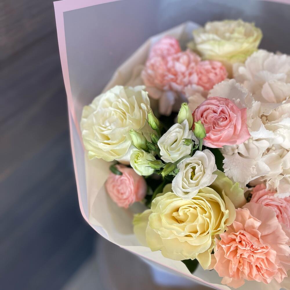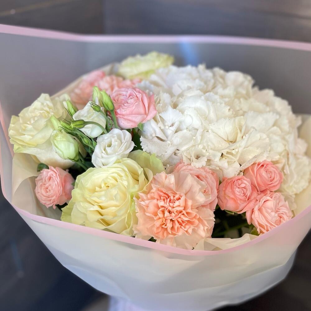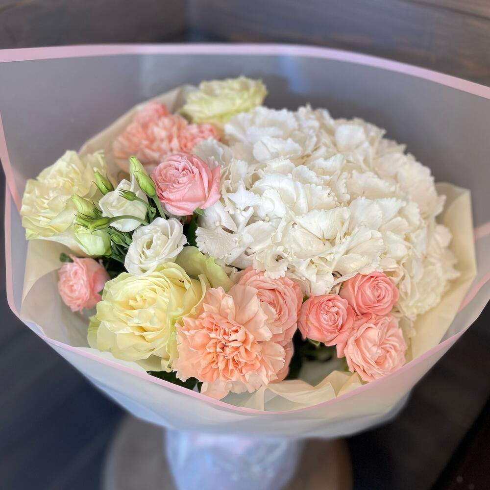 Гортензия - 1 шт. Роза - 3 шт. Упаковка - 1 шт. Лента атласная - 1 шт. Диантус - 2 шт. Роза кустовая пионовидная - 2 шт. лезинтус - 1 шт.