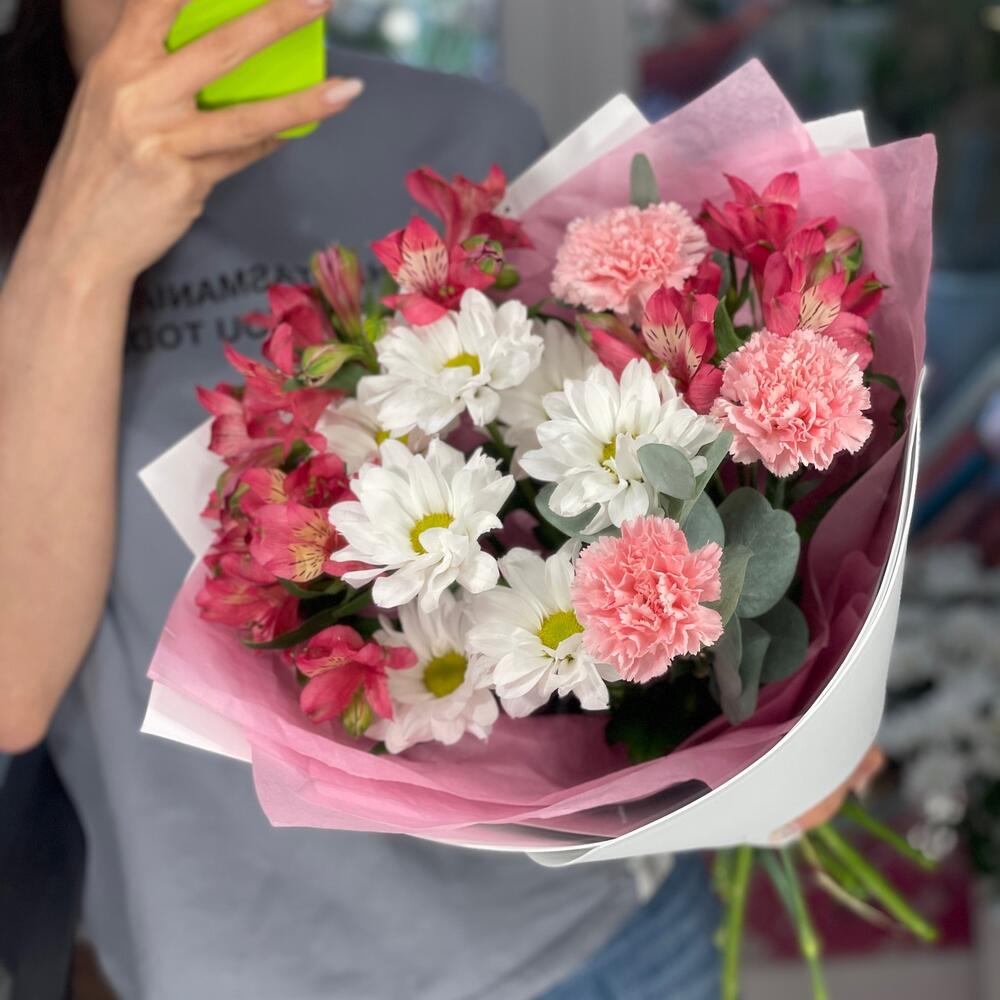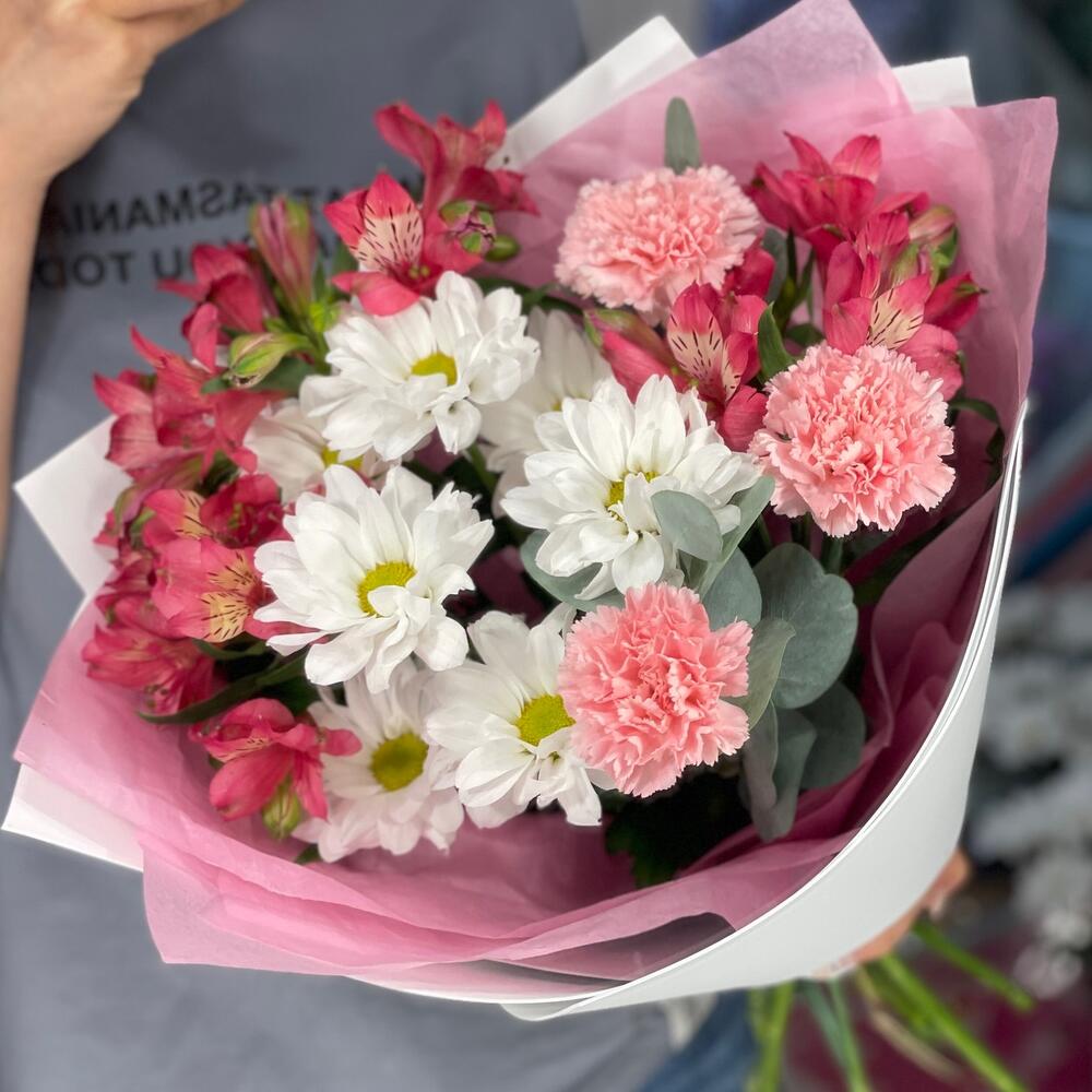 Альстромерия - 3 шт. Хризантема кустовая - 1 шт. Эвкалипт - 1 шт. Гвоздика - 3 шт. Лента атласная - 1 шт. Упаковка дизайнерская - 1 шт. Средство для продления жизни цветов - 1 шт.