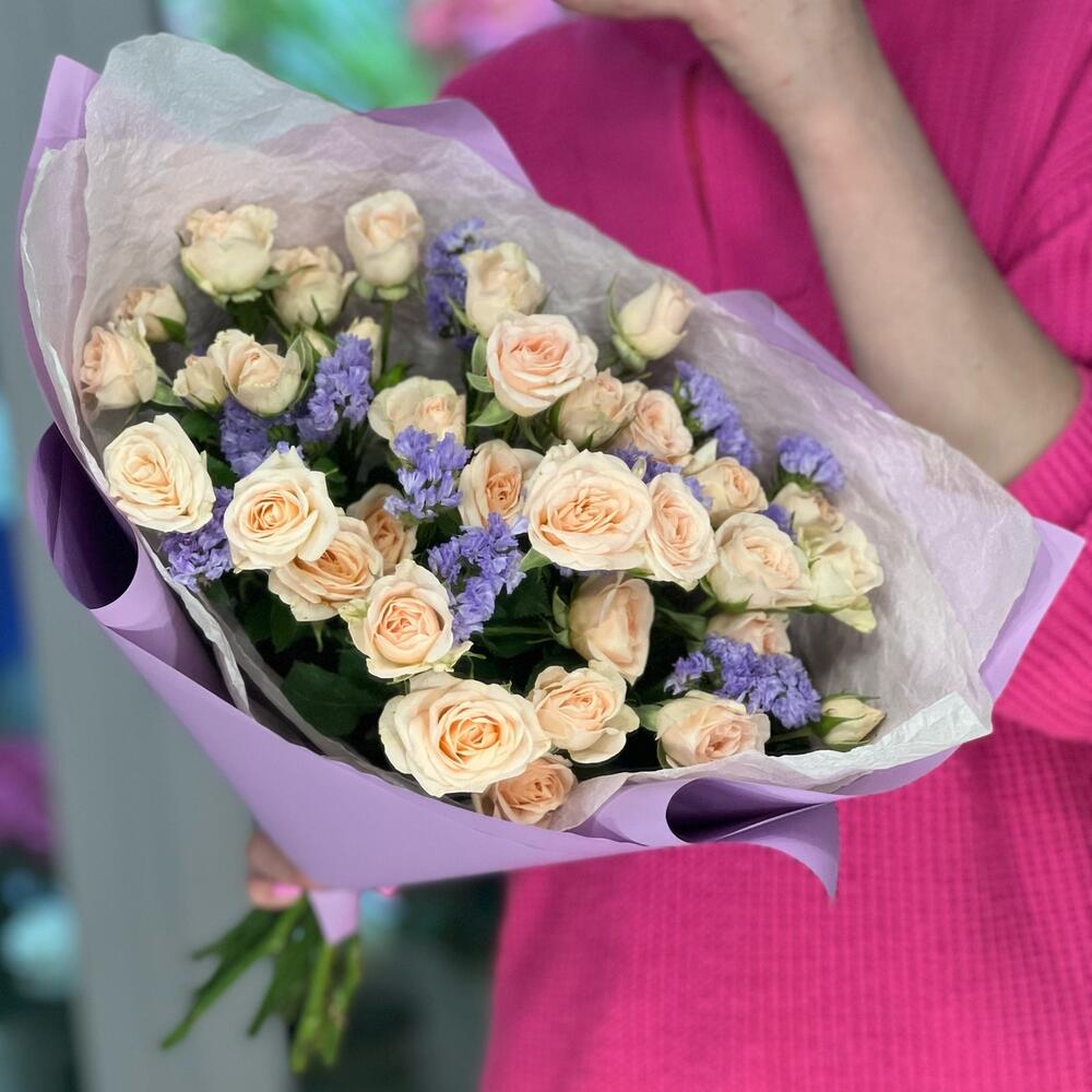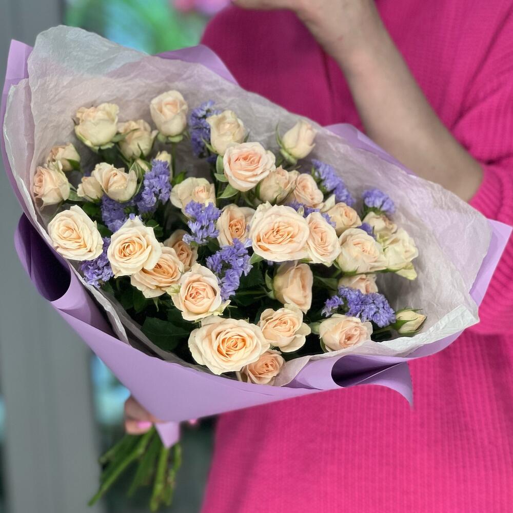 Роза кустовая - 7 шт. Статица - 1 шт. Средство для продления жизни цветов - 1 шт. Дизайнерская упаковка - 1 шт. Бумага тишью - 1 шт.