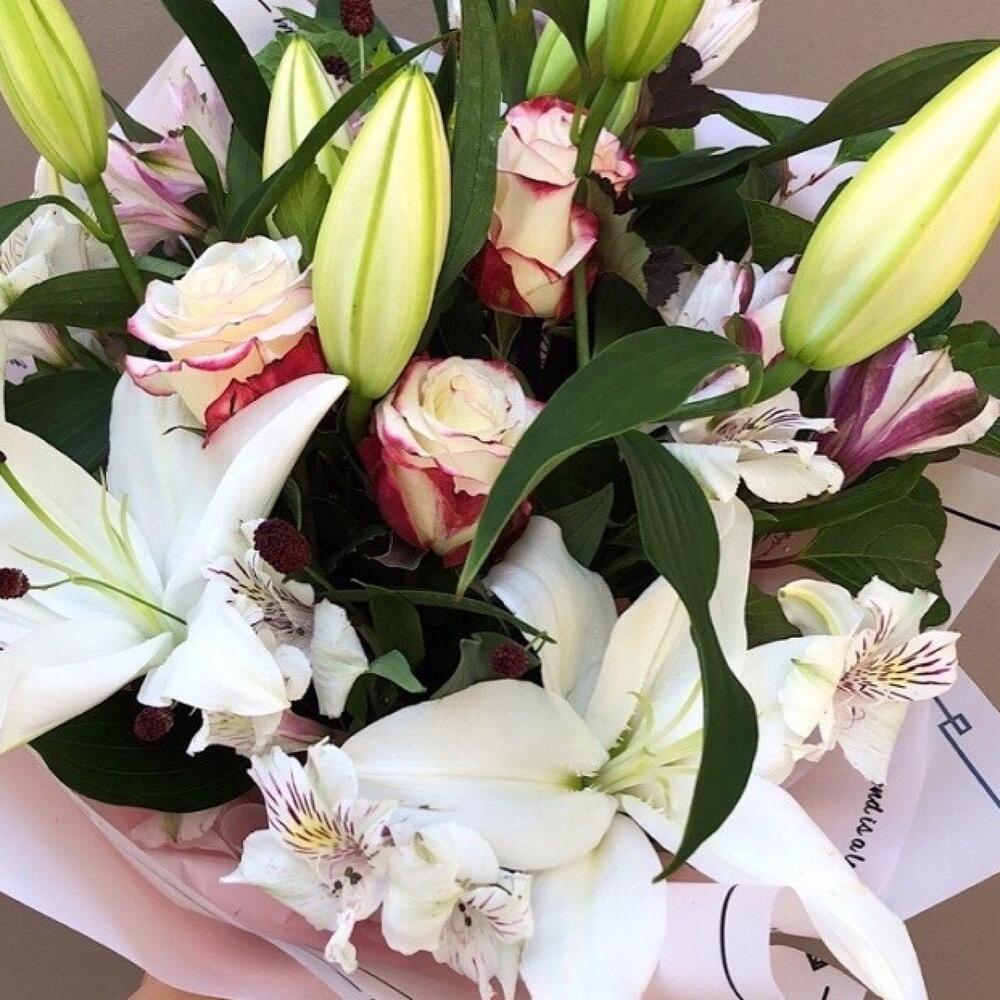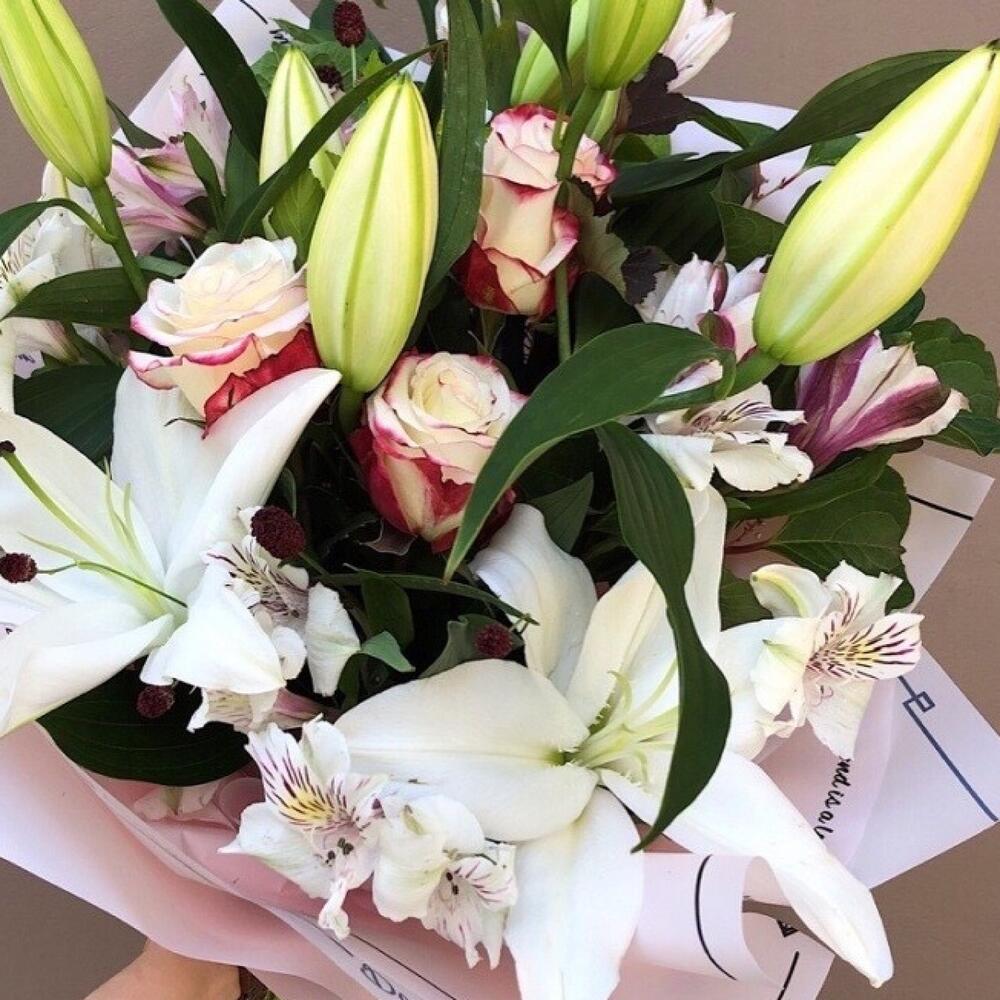 Альстромерия – 5 шт. Лилия – 3 шт. Роза – 3 шт. Лента атласная – 1 шт. Упаковка дизайнерская – 1 шт.