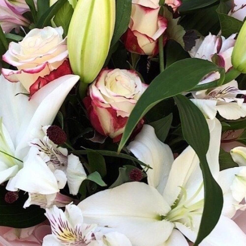 Состав букета: лилии, эквадорские розы, альстромерии. По вашему желанию мы можем внести в букет любые изменения: изменить цветовую гамму, состав букета, вид упаковки и др.Изящный букет из 3 белоснежных лилий, 3 эквадорских розочек и 5 бело-сиреневых альстромерий.Композиция оформлена нежной пленкой и атласной лентой.Букеты с лилией всегда выглядят величественно, пышно и объёмно.С лилией сочетаются почти все цветы. Композиции с лилией являются устоявшейся классикой, но в современной флористике подбирается много новых сочетаний, которые по-настоящему удивляют.Доступны изменения оттенка и количества цветов, упаковки и вида дополнительной зелени, размера и стоимости букета. Мы создаём букеты для каждого покупателя.Оформление стильным фетром, модной крафтовой бумагой, органзой, или, как на фотографиях, нежной сеткой.