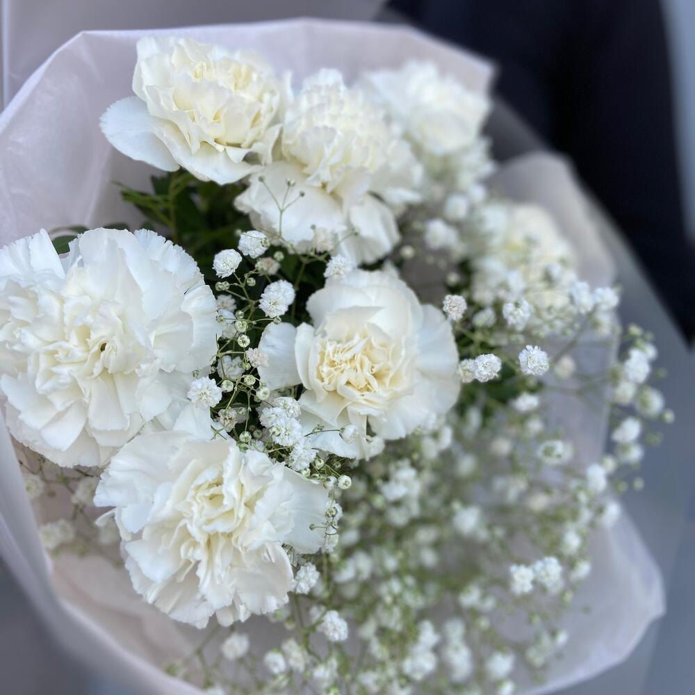 Гипсофила – 2 шт. Лента атласная – 1 шт. Диантус – 7 шт. Фисташка – 3 шт. Упаковка дизайнерская – 1 шт.