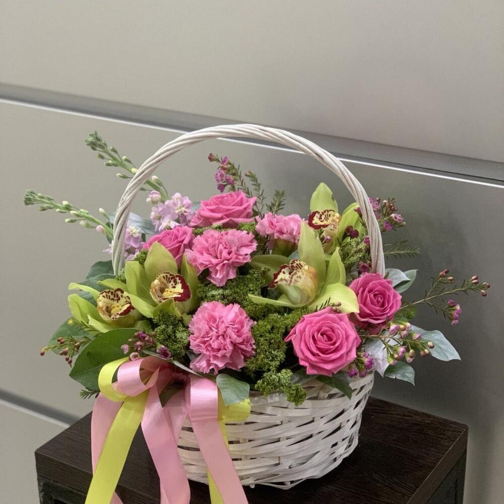 Маттиола – 2 шт. Орхидея Цимбидиум – 4 шт. Лента атласная – 3 шт. Диантус – 3 шт. Роза Россия – 4 шт. Хамелациум – 1 шт. Очиток – 2 шт. Корзина плетеная – 1 шт. Оазис флористический – 2 шт. Салал пучок – 1 шт.