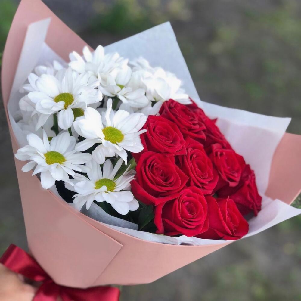 Хризантема кустовая – 3 шт. Роза Россия – 11 шт. Атласная лента – 1 шт. Фоамиран (упаковка) – 2 шт. Бумага тишью – 2 шт.
