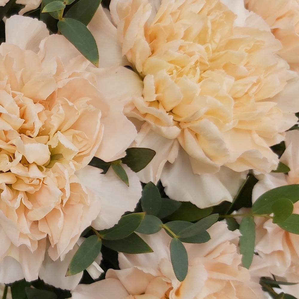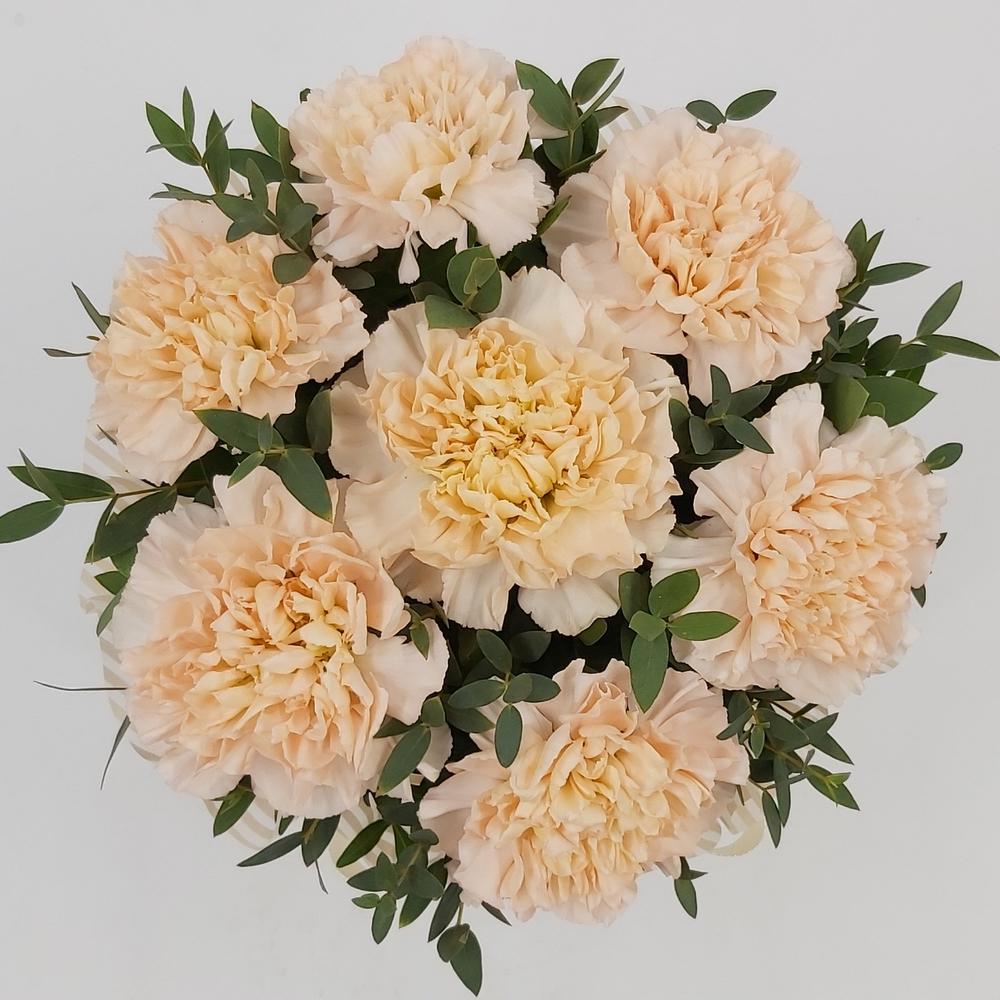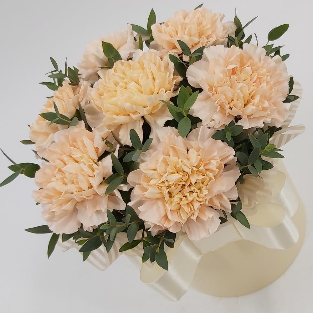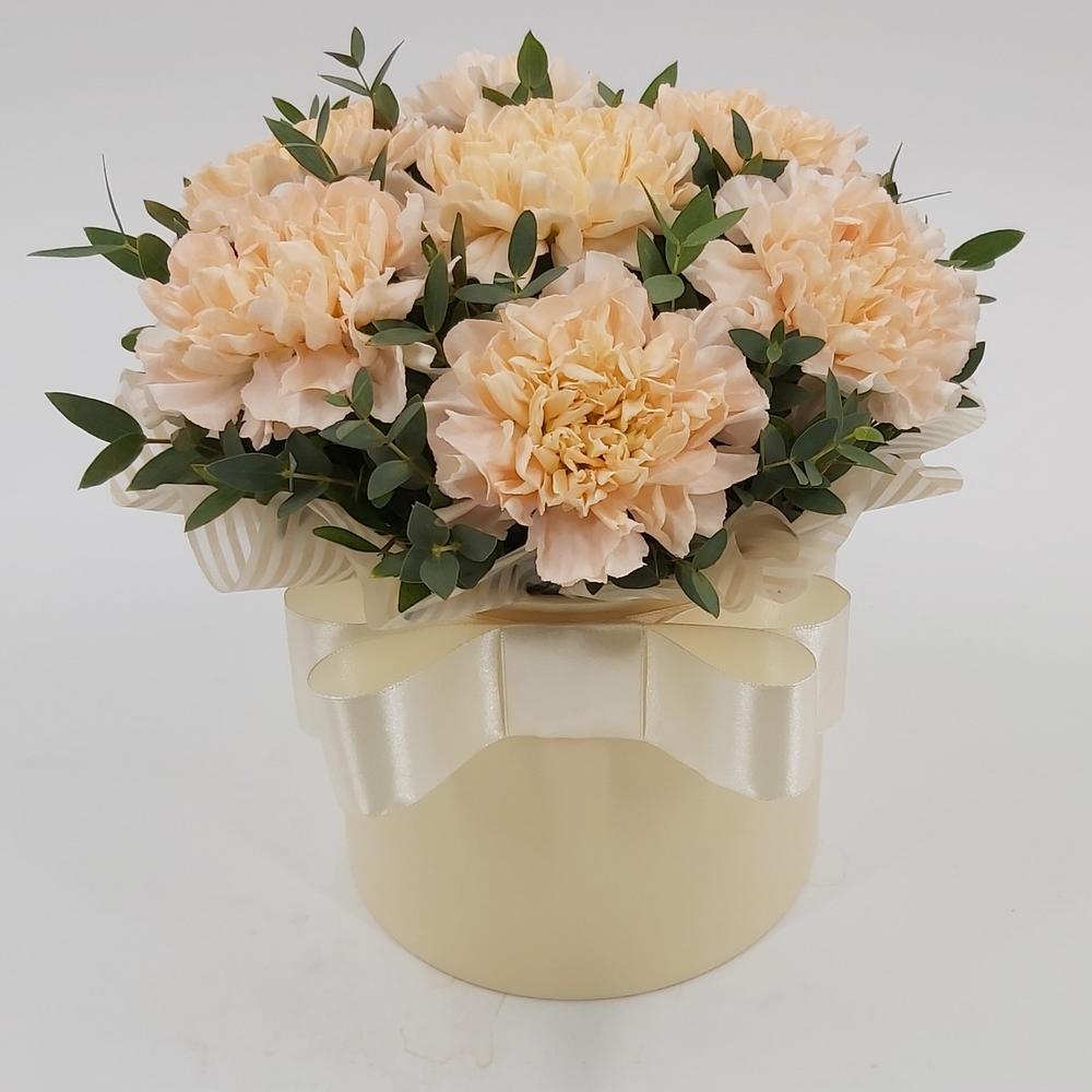 Элегантная и очень стойкая композиция из диантусов и эвкалипта в коробке. Такой презент всегда уместен и подойдёт для любого повода: День Рождения, именины, годовщина свадьбы, рождение ребенка, 8 марта, День Святого Валентина, выпускной и т.д. Можно вручить маме, сестре, подруге, коллеге, учителю, любимой.