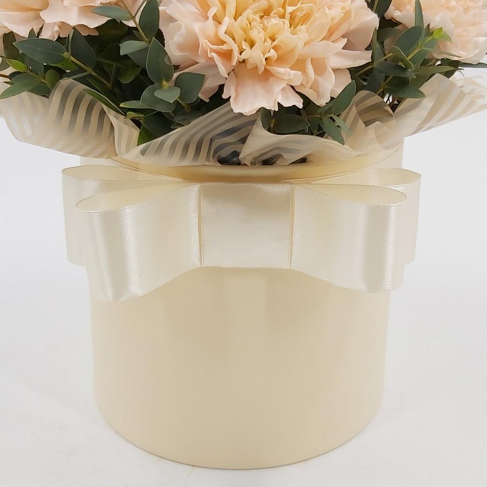 Зелень – 3 шт. Лента атласная – 1 шт. Коробка цилиндр – 1 шт. Флористическая губка (оазис) – 1 шт. Пленка дизайнерская – 1 шт. гвоздика сортовая (диантус) – 7 шт.